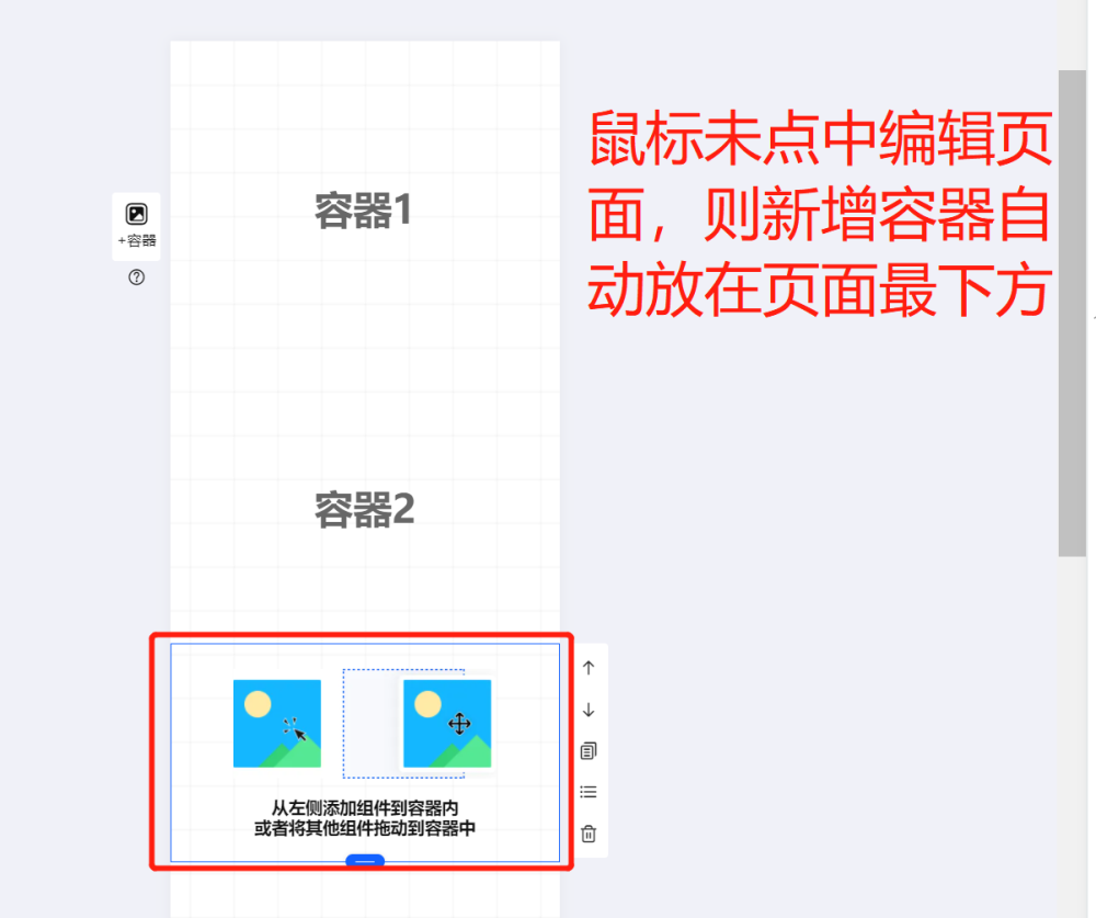 如果未点击容器,在编辑器左侧点击素材/组件,会自动生成一个容器,位于页面最下方 |