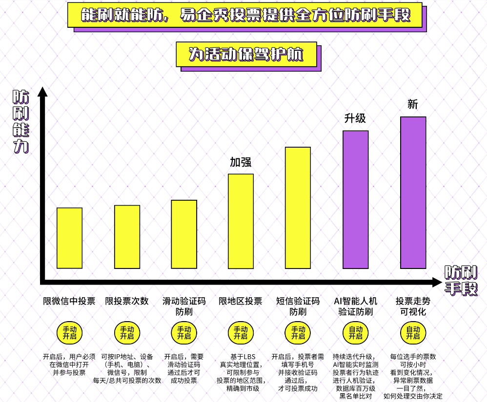 限制只能通过微信投票:微信账号有严格的安全管理,伪造大批量微信账号难度及成本极高;