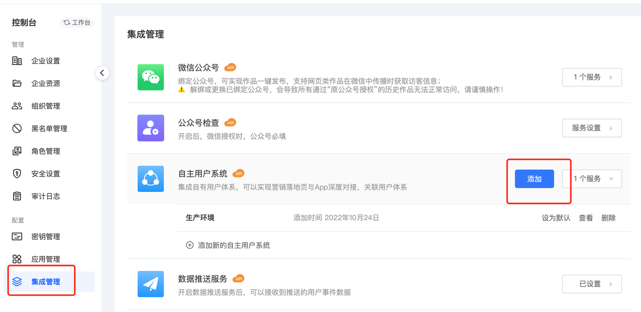> 在小程序中嵌入H5作品链接。 支持作品类型:互动、翻页H5、长页H5、表单。 # 准备 1. 支付宝小程序 2. 开发对接接口 3. 内容中台作品 # 支付宝小程序配置 1. 登录支付宝小程序开放平台 https://open.alipay.com 2. 创建小程序 如果已有小程序,直接使用小程序即可 https://open.alipay.com/develop/manage 小程序一定要是**企业账号**创建的,个人账号功能会受限。  3. 开发设置 小程序创建好后,根据自己开发需要配置加密、服务器ip白名单等信息。  4. 配置业务域名 针对小程序内打开 H5 页面,提供 web-view 组件内嵌,需配置 H5 页面的域名地址。 比如,要在web-view 中嵌入的地址为 https://eqs.eqxiu.cn/v/104543?cc=25THPMw7 则需要配置业务域名为:https://eqs.eqxiu.cn 支付宝小程序业务域名配置入口  输入业务域名地址,点击下载校验文件,把下载下来的校验文件,发给易企秀,等待易企秀配置好后,点击确定保存。  易企秀自定义二级域名设置是在内容中台控制台->企业设置  # 嵌入H5授权模式选择 1. 无授权模式 直接在小程序的web-view的src中嵌入作品链接即可。 例如: ``` <web-view src="https://h5.eqxiu.cn/gs/Yh7d8JaC"></web-view> ``` 2. 手机号授权模式 同 “无授权模式” 3. 自定义授权模式 - 授权页授权 同 “无授权模式” - code授权 code授权需要生成用户的临时code码,跳转时用于获取用户信息 例如: ``` <web-view src="https://h5.eqxiu.cn/gs/Yh7d8JaC?code=eqxiu_528a3021d1d34d56a"></web-view> ``` code授权需要企业参与开发对接 # 开发对接接口 1. 对接业务流程 对接业务流程图  开发规则以及更多对接信息参见https://hc.eqxiu.cn/doc/23/ 2. 逻辑说明 1. 访客登录支付宝小程序 2. 企业获取到支付宝小程序的用户信息 3. 企业将支付宝小程序用户信息放入缓存(可以是redis)中,并生成一个code来与缓存建立对应关系 4. 访客在小程序中点击抽奖游戏 5. 在打开有奖游戏前,需要把第3步生成的code拼接到抽奖游戏链接后面 6. 易企秀拿到code值,调用企业提供的获取用户信息接口获取信息 7. 易企秀完成访客授权 8. 访客继续进行抽奖游戏 3. 配置自定义授权接口 登录内容中台,https://www.eqxiu.cn 菜单切换到控制台,在控制台菜单中访问 集成管理-> 自主用户系统 -> 添加。 其中 授权页地址可以为空,如果不为空的话,访客在首次访问链接时,会跳转到该地址。   # 制作作品 1. 登录内容中台制作作品 https://www.eqxiu.cn 2. 创建作品 以互动为例,选择模板创建作品,进入编辑器 创建作品时,选择自定义授权模式,并选择上一步设置的接口。  3. 获取作品链接 制作好作品,获取链接   4. 小程序webview里放入作品地址 ``` <web-view src='https://eqs.eqxiu.cn/v/107148?cc=mkeNtXuv&code=xxxx'></web-view> ``` 其中,code=xxxx的xxxx为企业为登录支付宝小程序的访客生成的一个编码,供易企秀获取用户信息使用 code参数需要在访客访问链接之前拼接在地址后面就行。 可以直接通过变量的方式在web-view的src中,或其他方式都可以。
