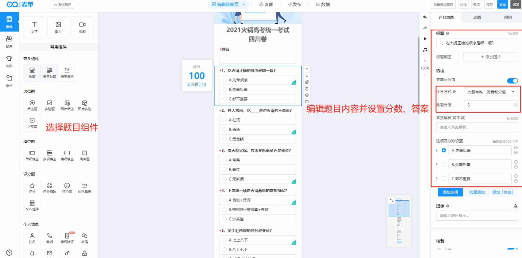 考试测评的制作,其主要会涉及题目、分数、答案、答案解析、随机抽题、题目乱序、考试时间等设置,在一些趣味测评中,还需要使用跳题规则;