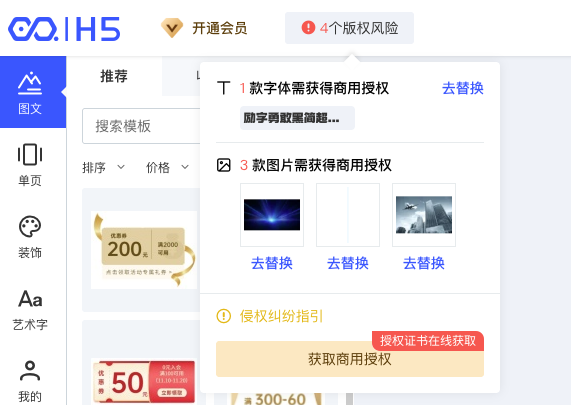 易企秀平台中所经营素材均为正版可商用素材,其中部分素材因合作方或作者要求,需要获取授权方可使用;如果您的作品中包含此类素材,而您并没有获取相应授权,则会提示您需要获取授权后才能使用。