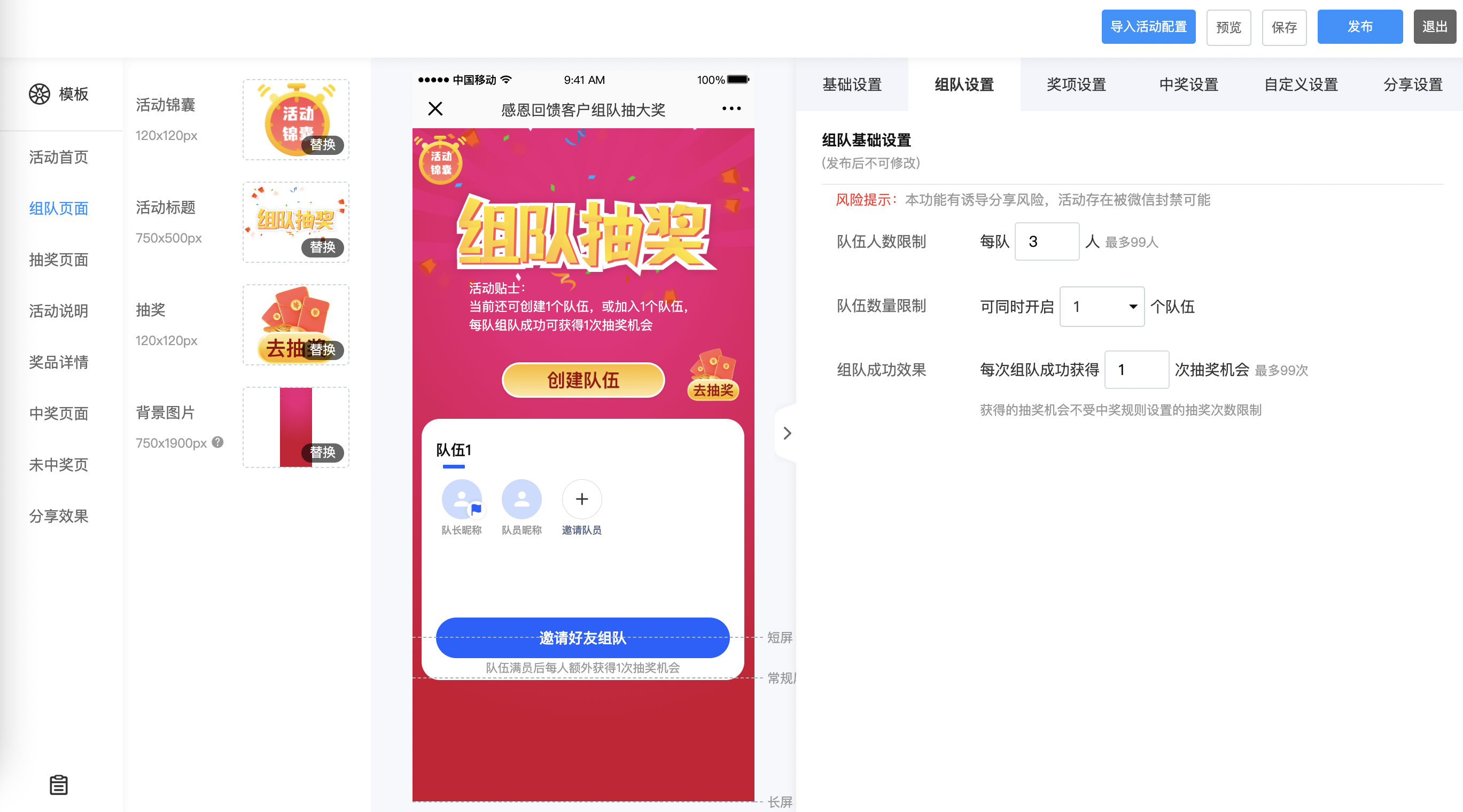 促进种子用户完成任务获得组队抽奖机会,是适合移动端运营和社群运营等用户拉新和存量促活的营销活动。