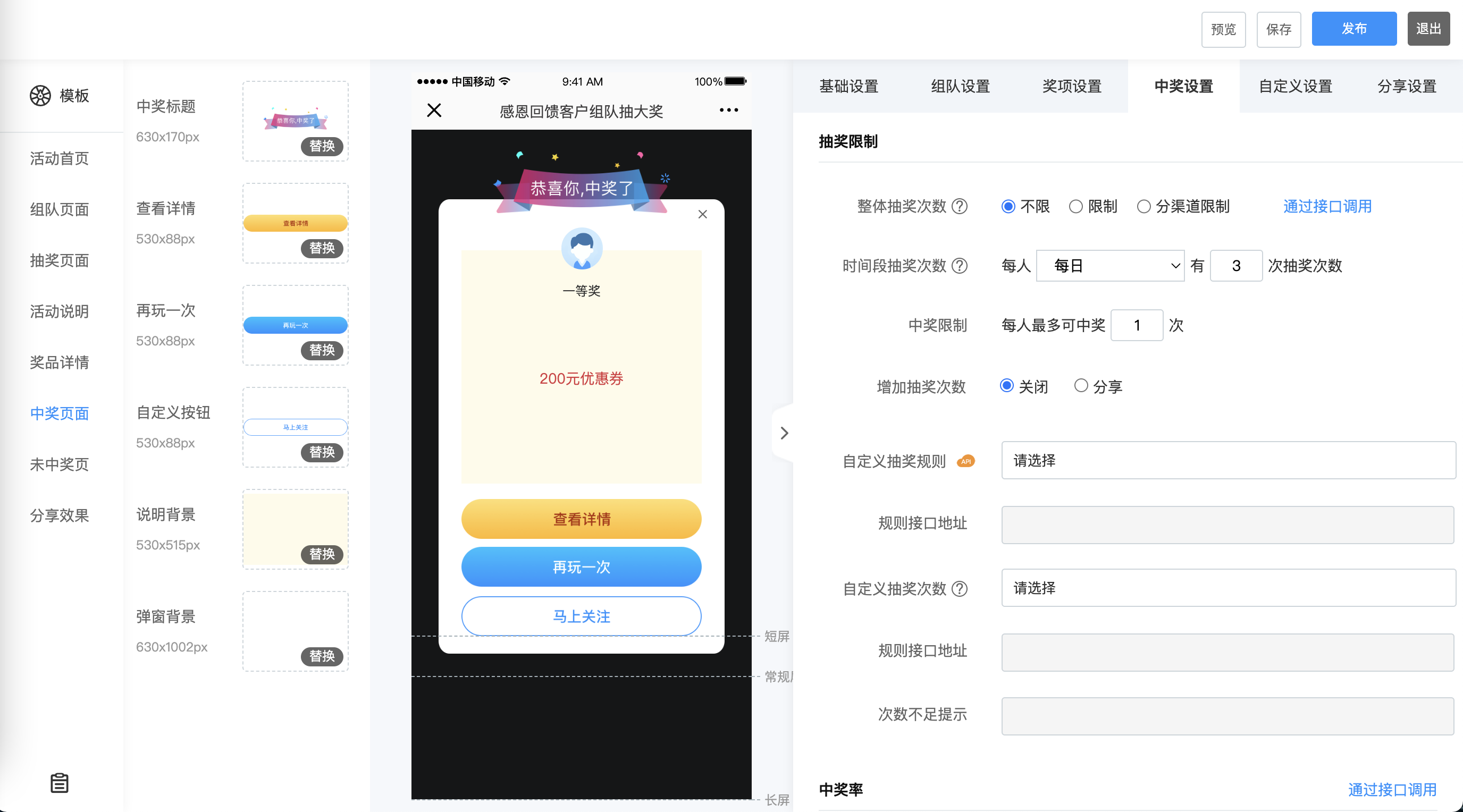 7、活动背景、抽奖设置等都可根据企业的品牌形象或者营销热点自行替换,如已对接完成小程序、APP嵌入,