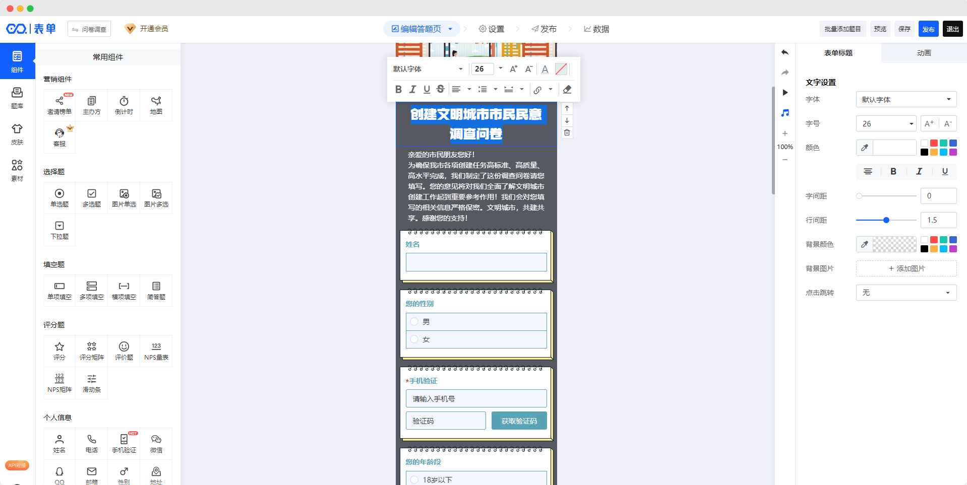 进入编辑器后,即可对问卷题目、介绍文案等,按照自己的需要进行调整编辑。
