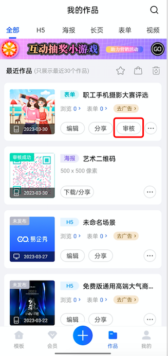 易企秀表单–投票评选,支持文字投票、图片投票、视频投票,投票对象可以是纯文字也可以是图片以及视频; 在“作品”列表中找到想要进行审核报名的作品,选择“审核”  在“待审核”中可以看到已经报名的的人并进行审核