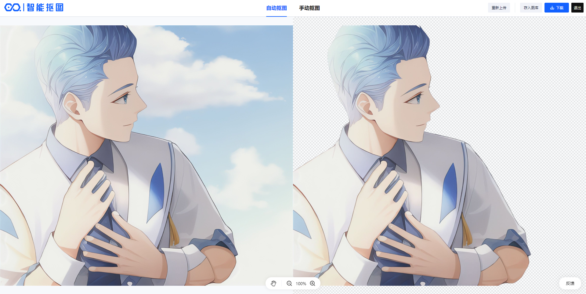 完成抠图后可下载到本地或存入图库,可点击“重新上传”进行再次抠图,还可以切换至手动抠图,进行图片指定区域的抠图操作。