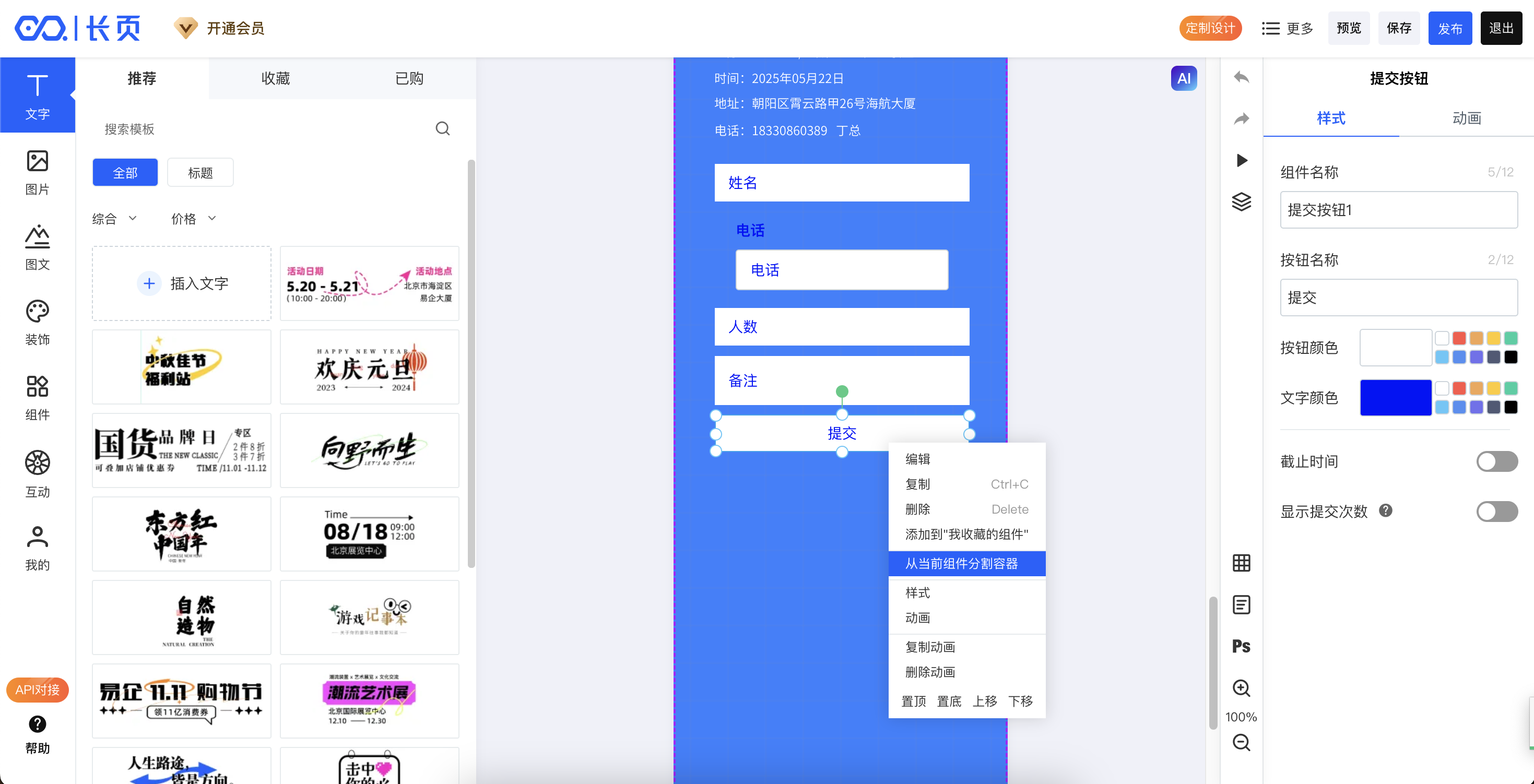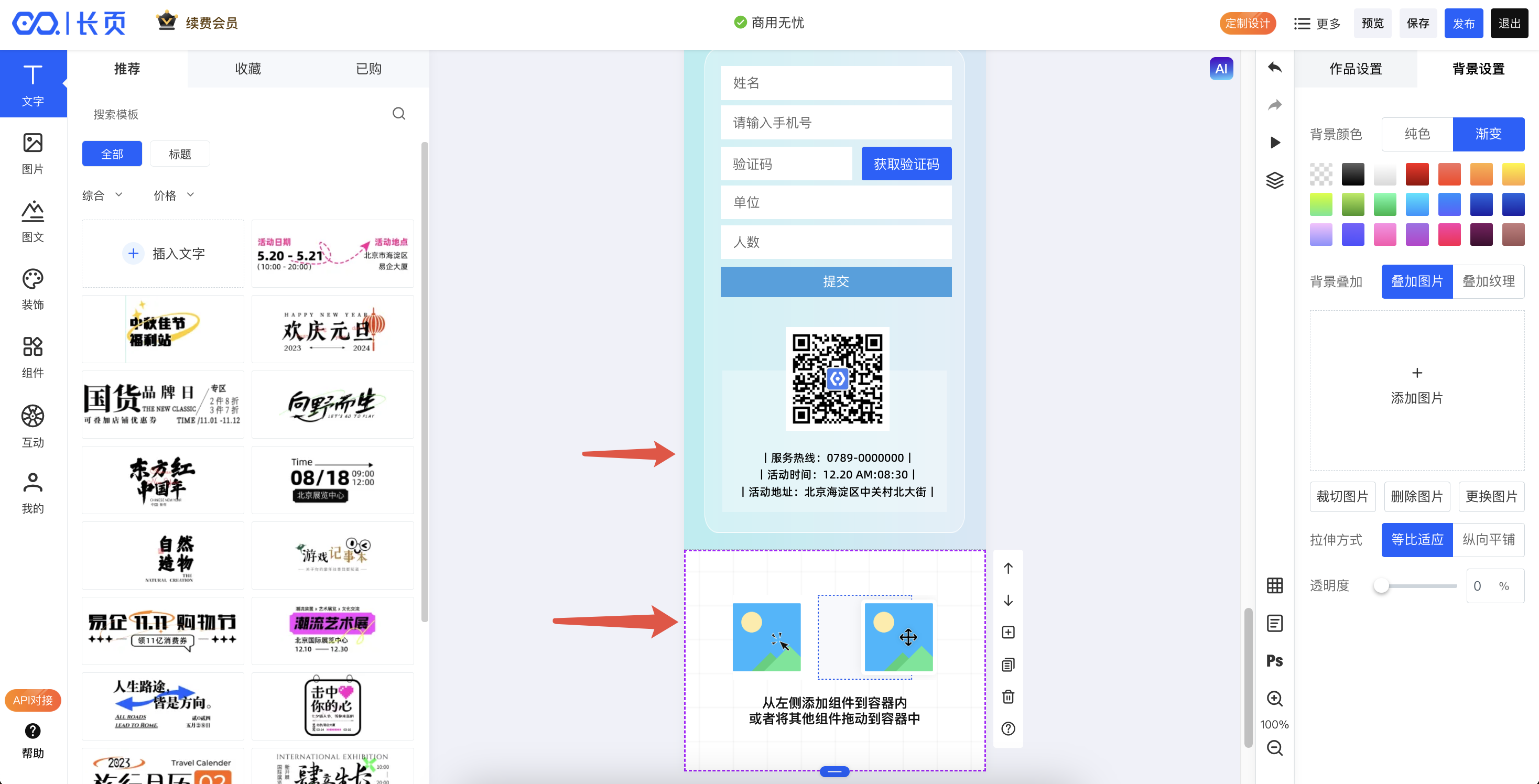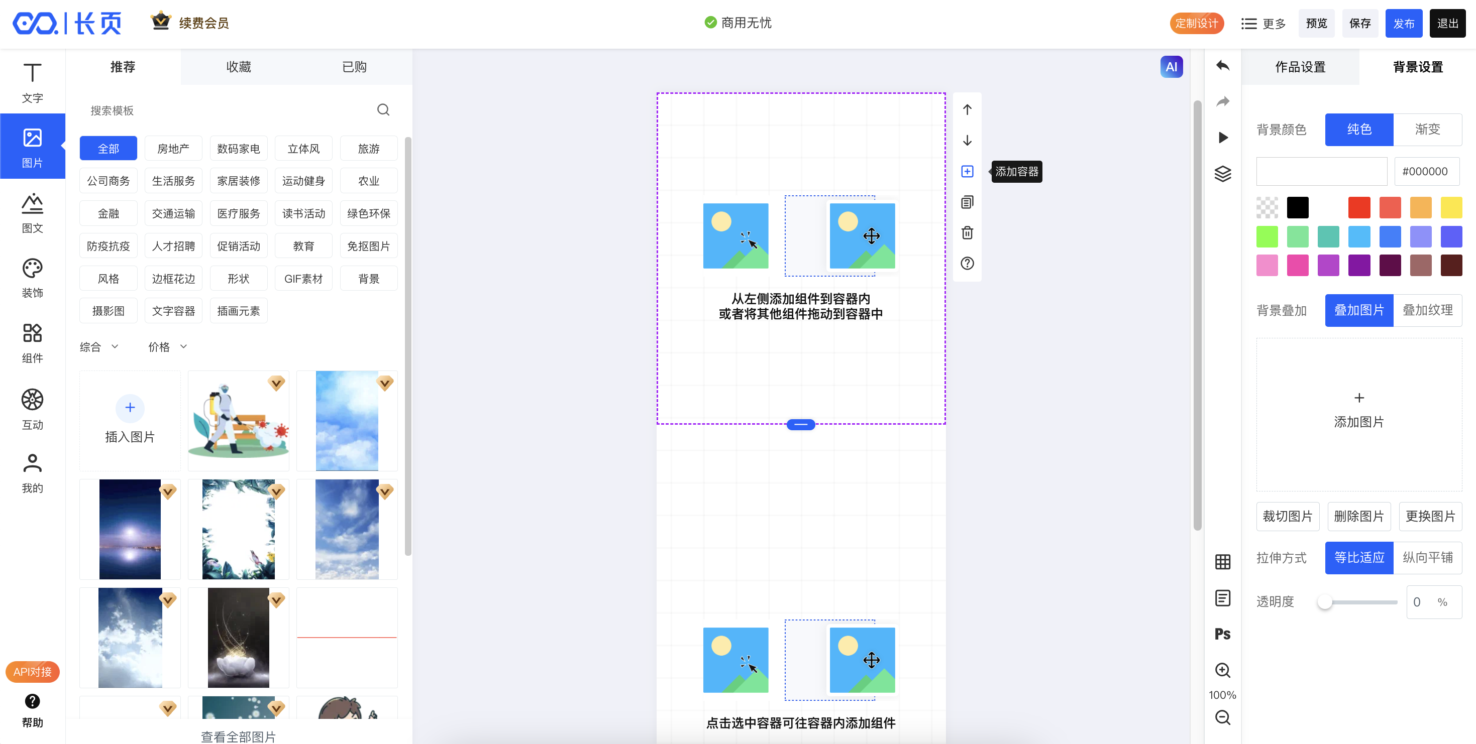 现在,一个长页作品,就是由多个容器组成,每个容器里可以装载任意数量的组件(包括文字、图片等所有元素均视为组件,即构成长页内容)。