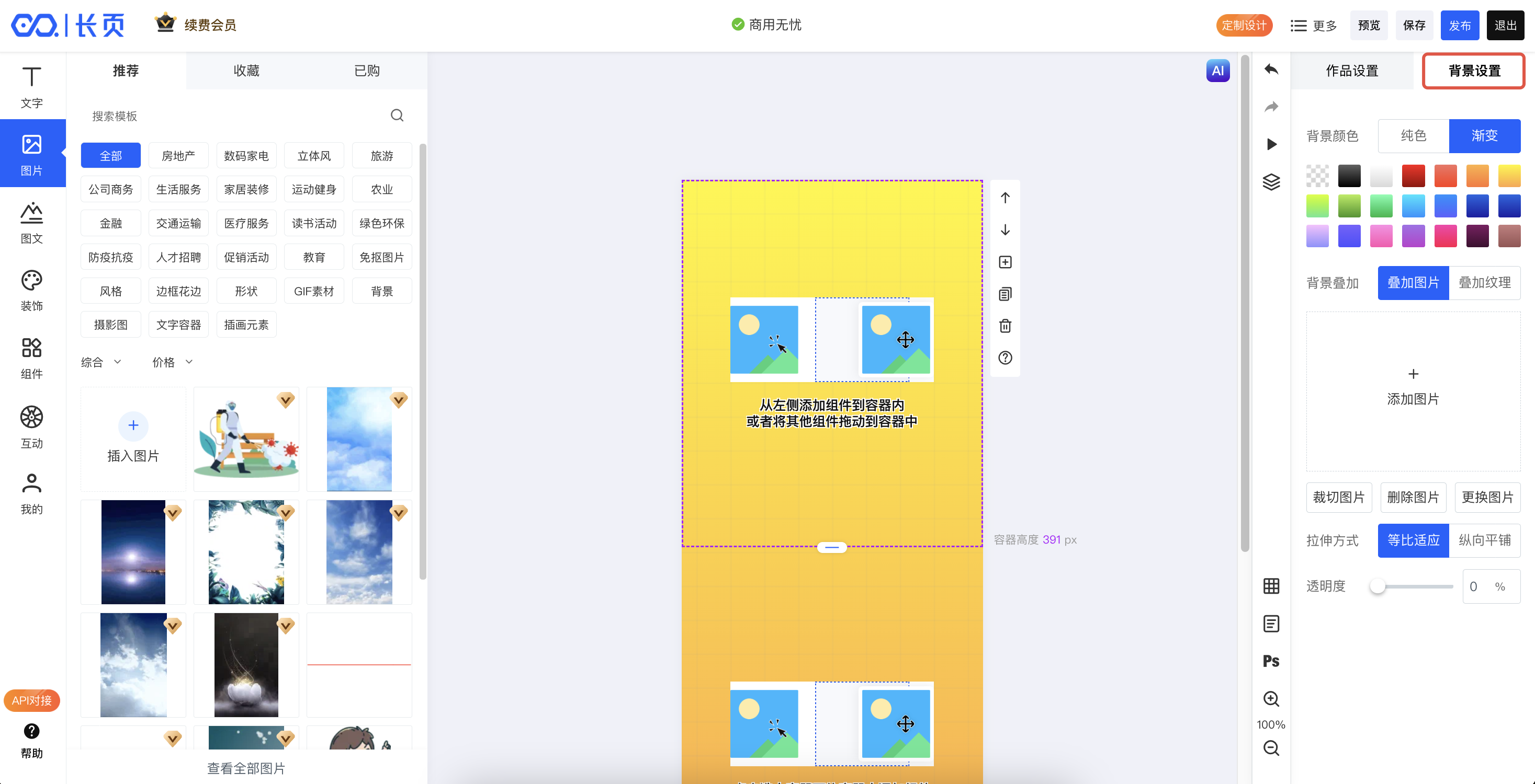 在制作长页过程中,可以为长页设置背景,该背景可作用于整个页面,即所有容器均会带有该背景。