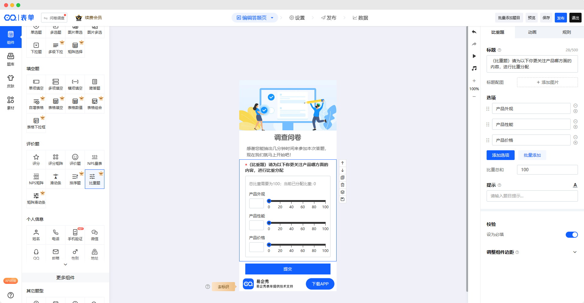 进入表单编辑器--组件--评价题--比重题,点击即可添加到作品中。