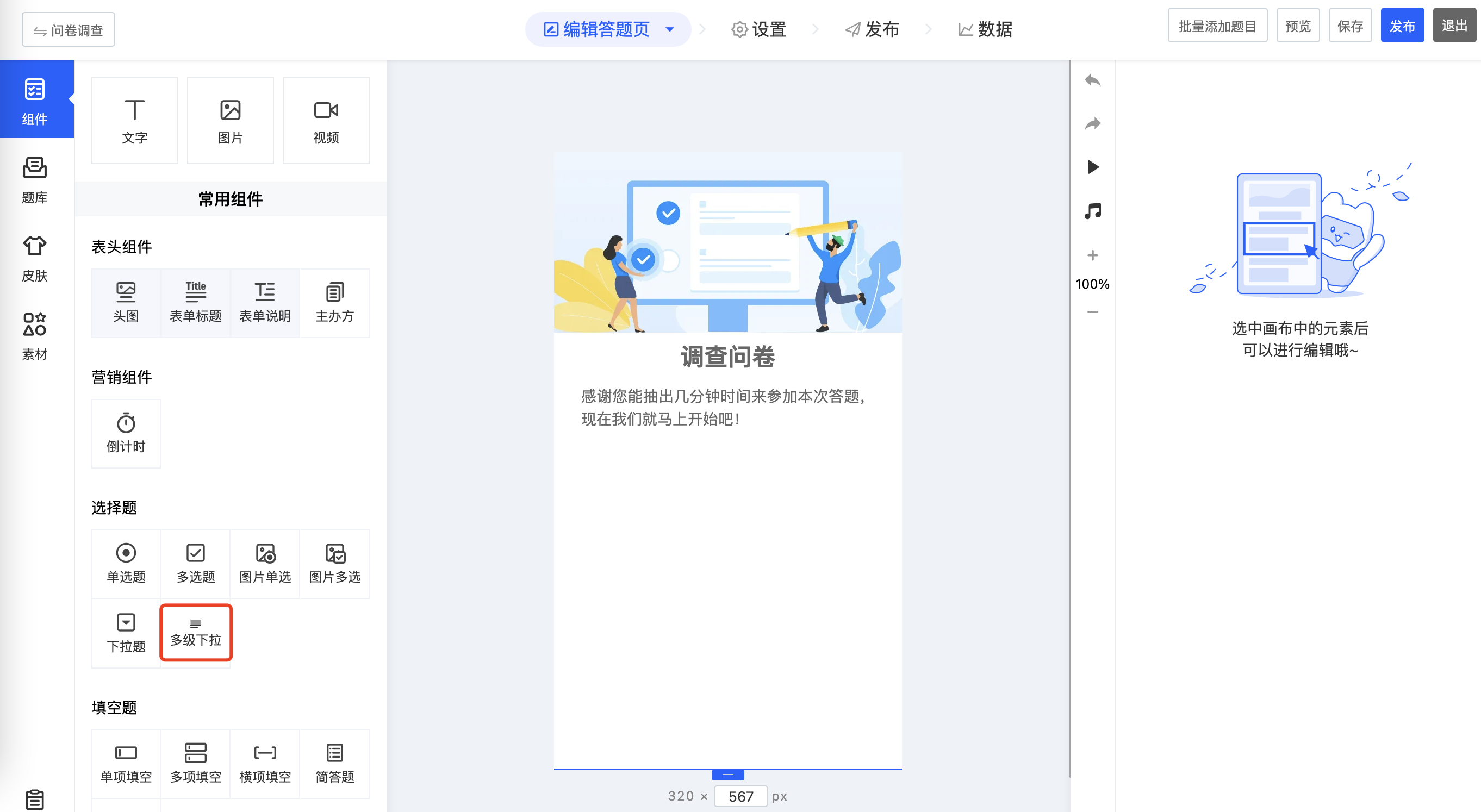 1、进入表单编辑器,在组件-选择题中可以看到新增了一个多级下拉组件。