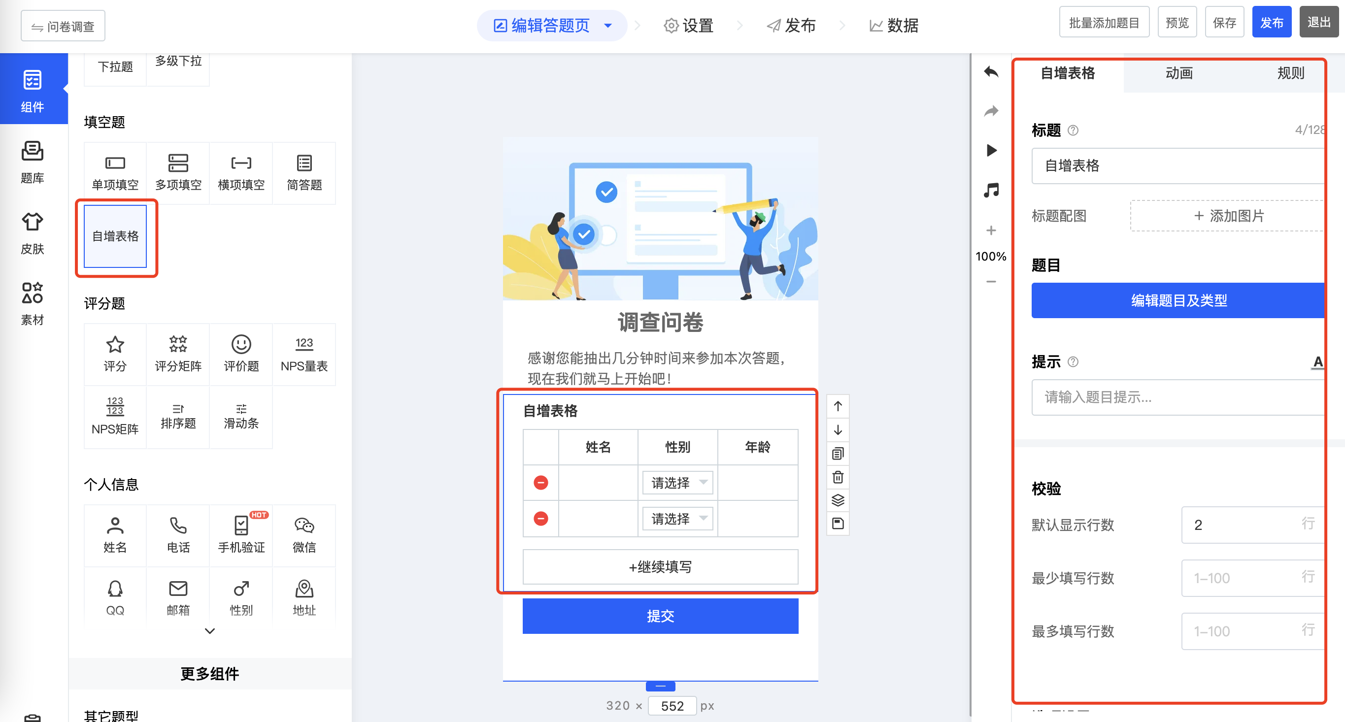表单编辑器填空题中新增「自增表格」组件,方便填表者在作品页面自增表格。