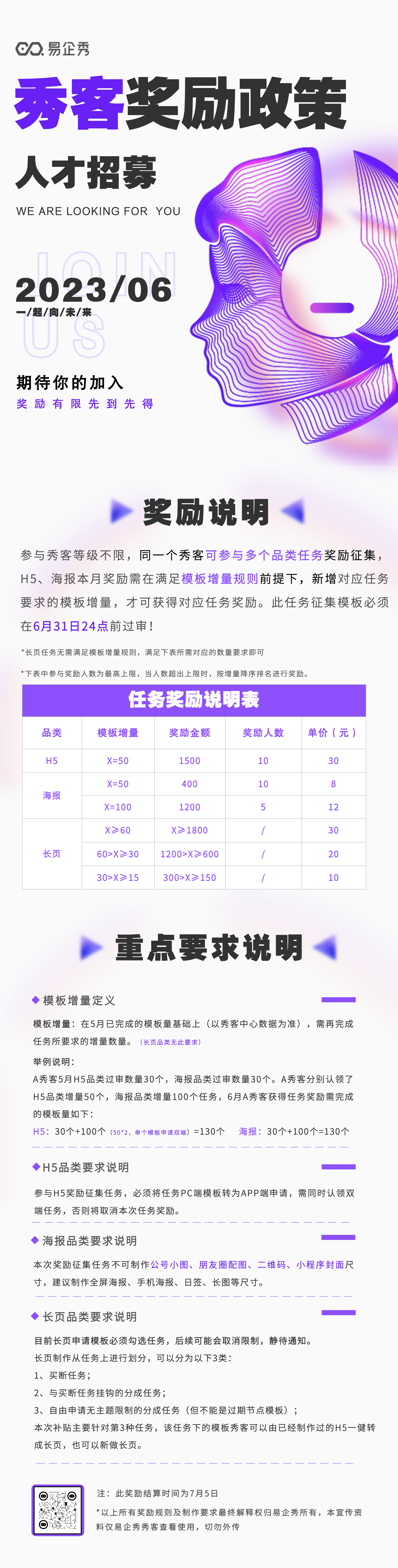 为加速推进平台模板全面正版化,现特推出“模板提量奖励政策”,对有余力制作更多模板的秀客进行现金奖励,多做多奖。大家齐力早日实现全平台模板100%正版的目标,降低版权风险的同时,以“版权”的痛点吸纳更多的用户,从而带来更多的收入。力出一孔,共赢未来!具体奖励规则如下: