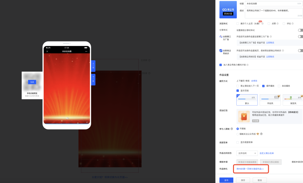 H5封面转海报功能入口位于H5编辑器-预览和设置-作品转化(将H5的第一页转为海报)
