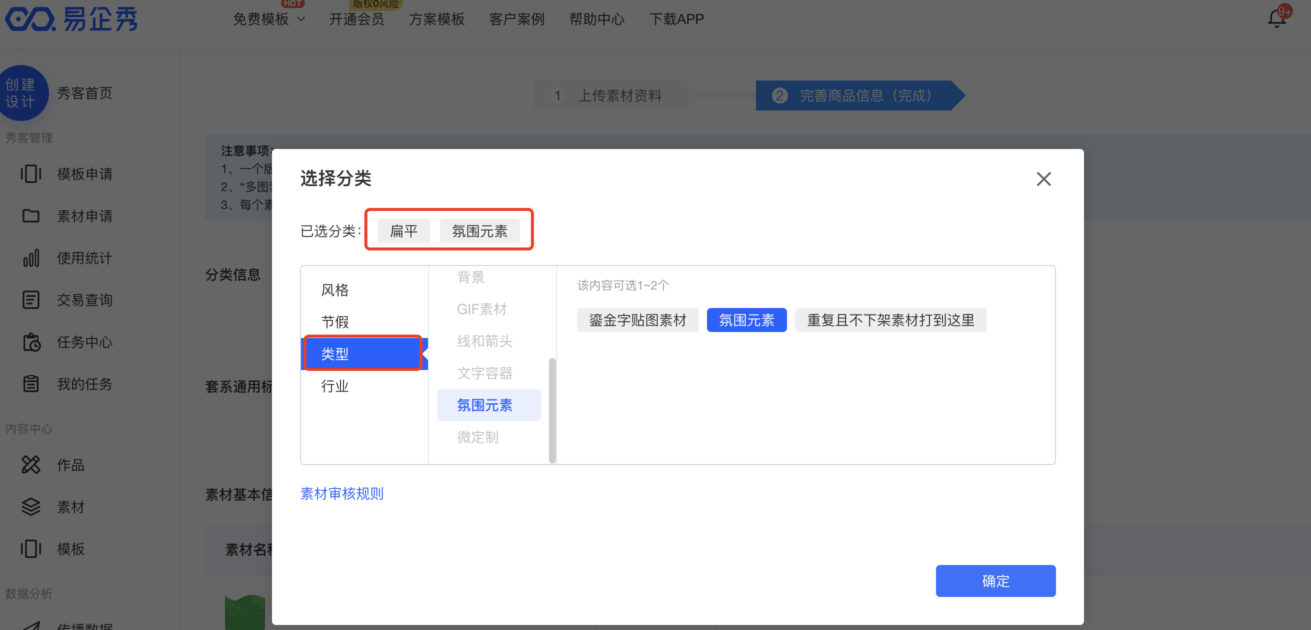 7. 勾选分类,至少勾选2个分类,其中风格必选;套系若无其他适用套系内所有素材的分类,可勾选类型中的氛围元素。