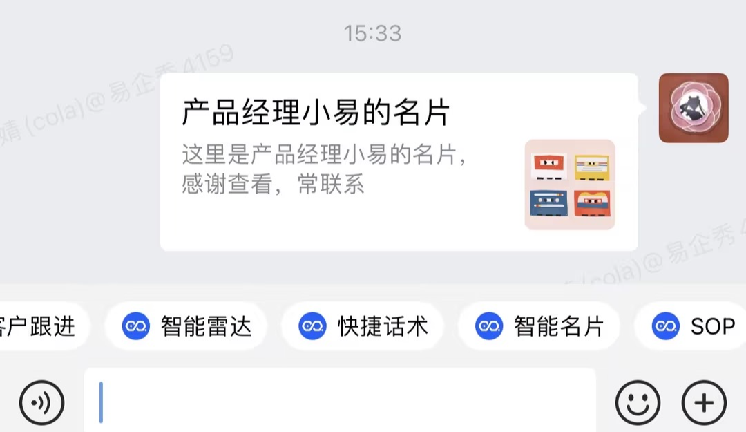 成员在企业微信与外部客户聊天时,移动端底部或电脑端侧边的【快捷话术】【智能雷达】【客户跟进】【智能名片】【SOP】等页面需要配置才可展示并使用(如图)