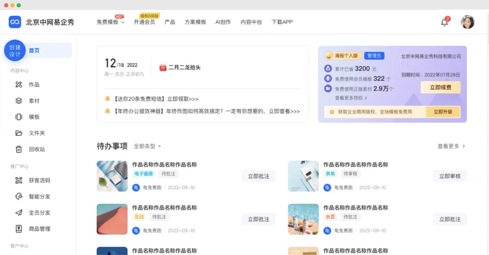包含专业版所有权益,企业商用,去除易企秀标识50次、4人在线协作、全员分发、智能分发等超多权益,额外赠送一个同等会员权益子账号,1000条短信包。推荐教育、传媒等企业营销使用。