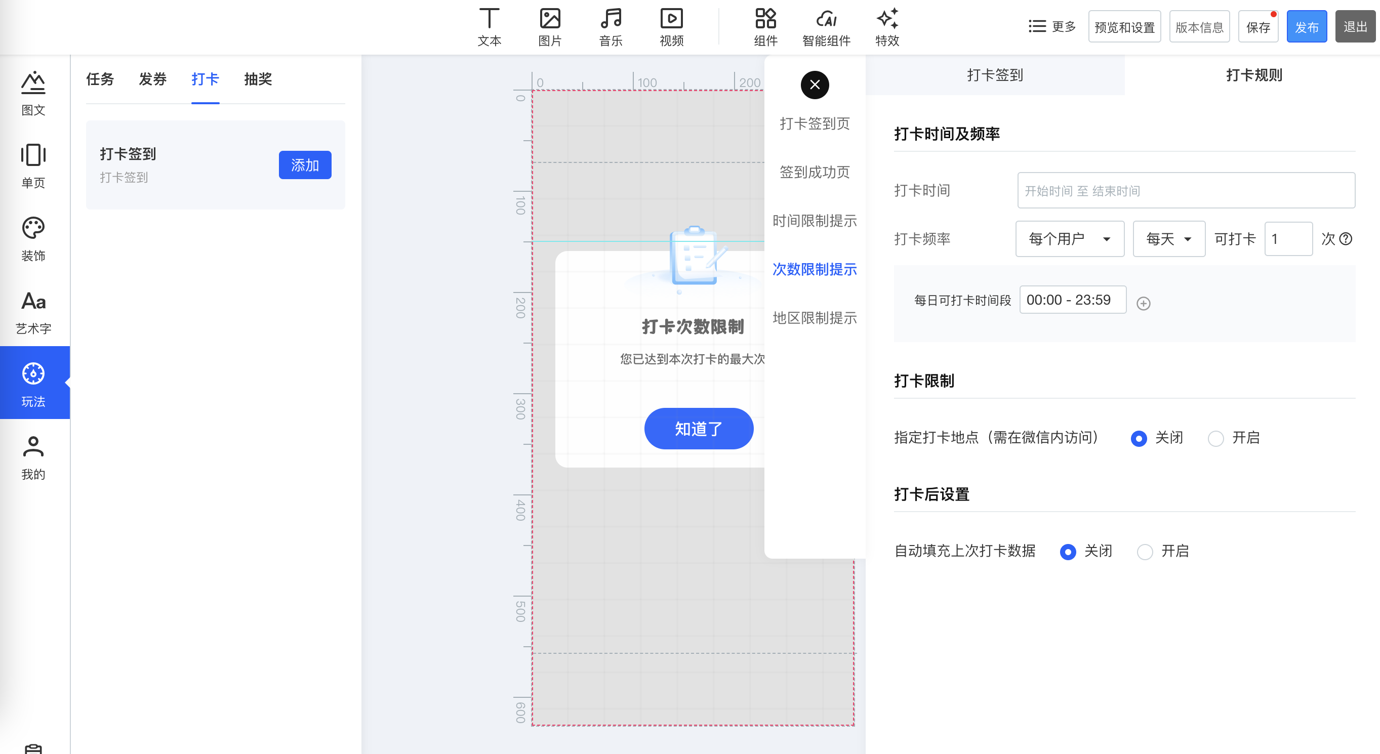 2、点击添加,在画布中添加打卡签到玩法,同时右边出现设置内容,支持预设打卡名单,仅允许打卡名单上的访客进行打卡。