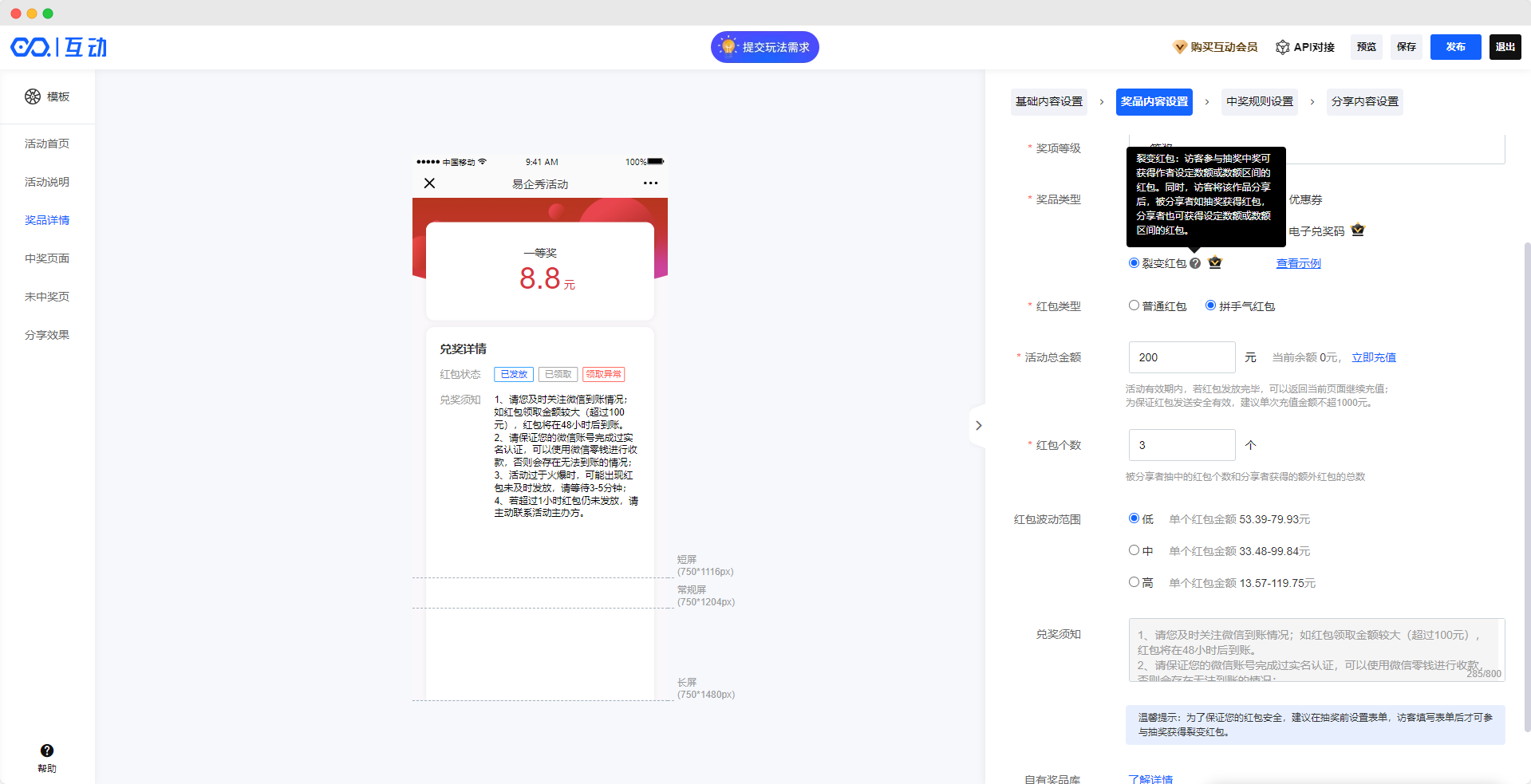 进入互动编辑器,点击奖品内容设置--奖品类型选择“裂变红包”,设置红包内容即可。
