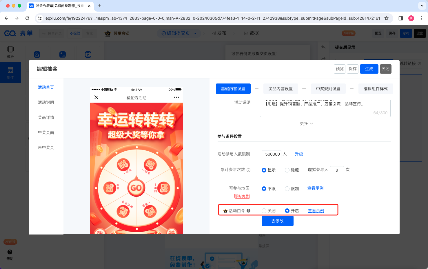 设置完成后,填写表单作品后,才可访问该活动进行抽奖。