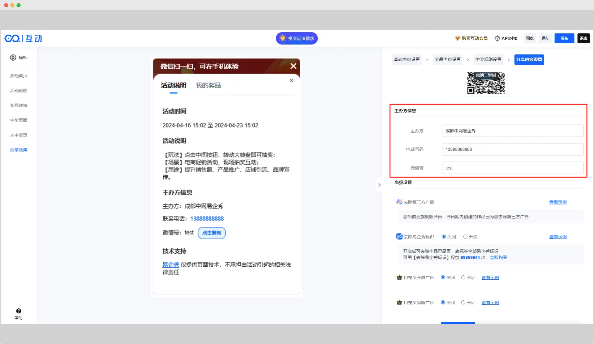 在表单和互动作品中,均可进行主办方设置,对应在作品中,会有固定的位置展示出自己的品牌信息。