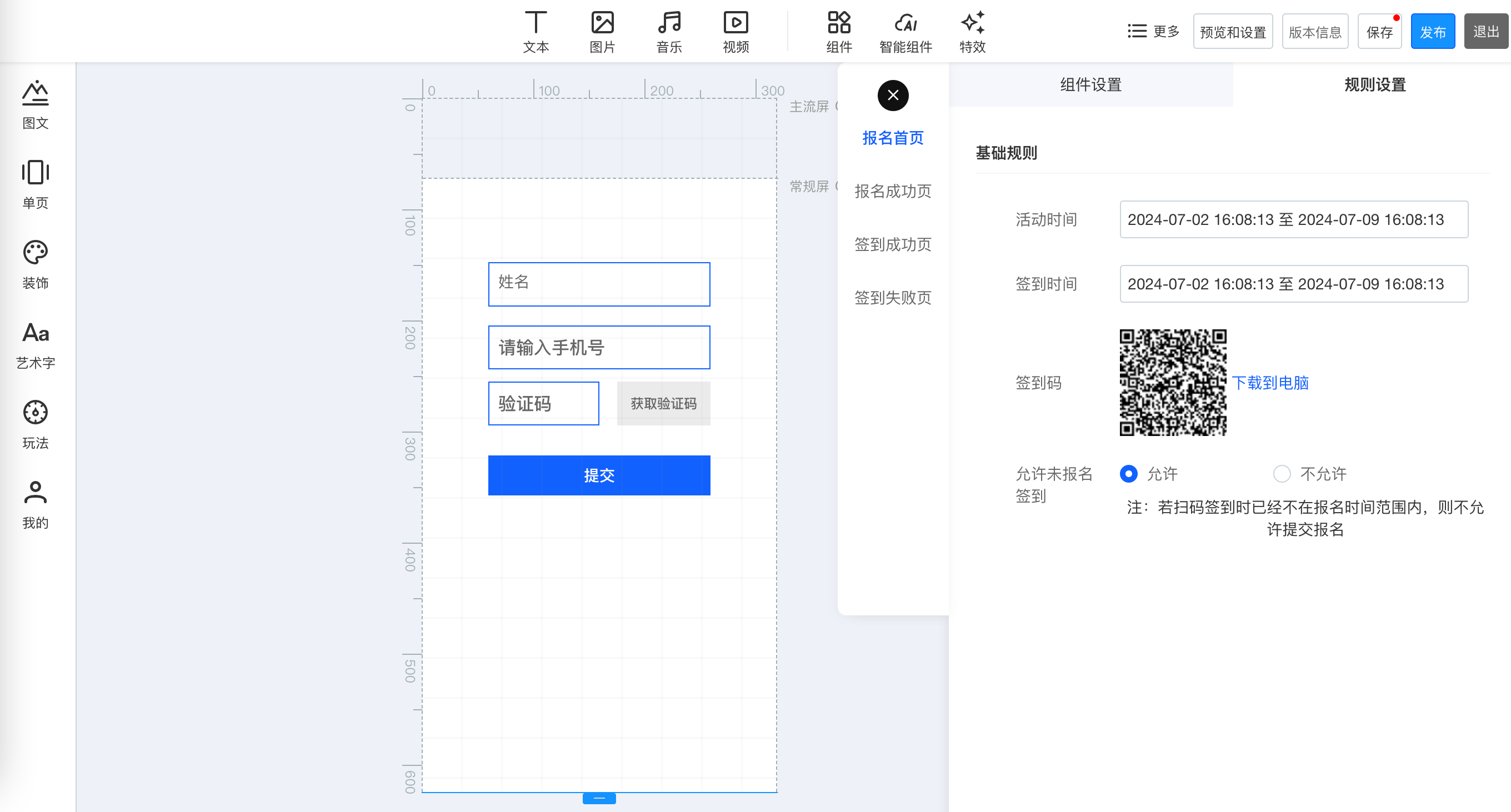 3.1 将报名签到玩法添加到玩法中,可以切换页面进行各个页面的编辑