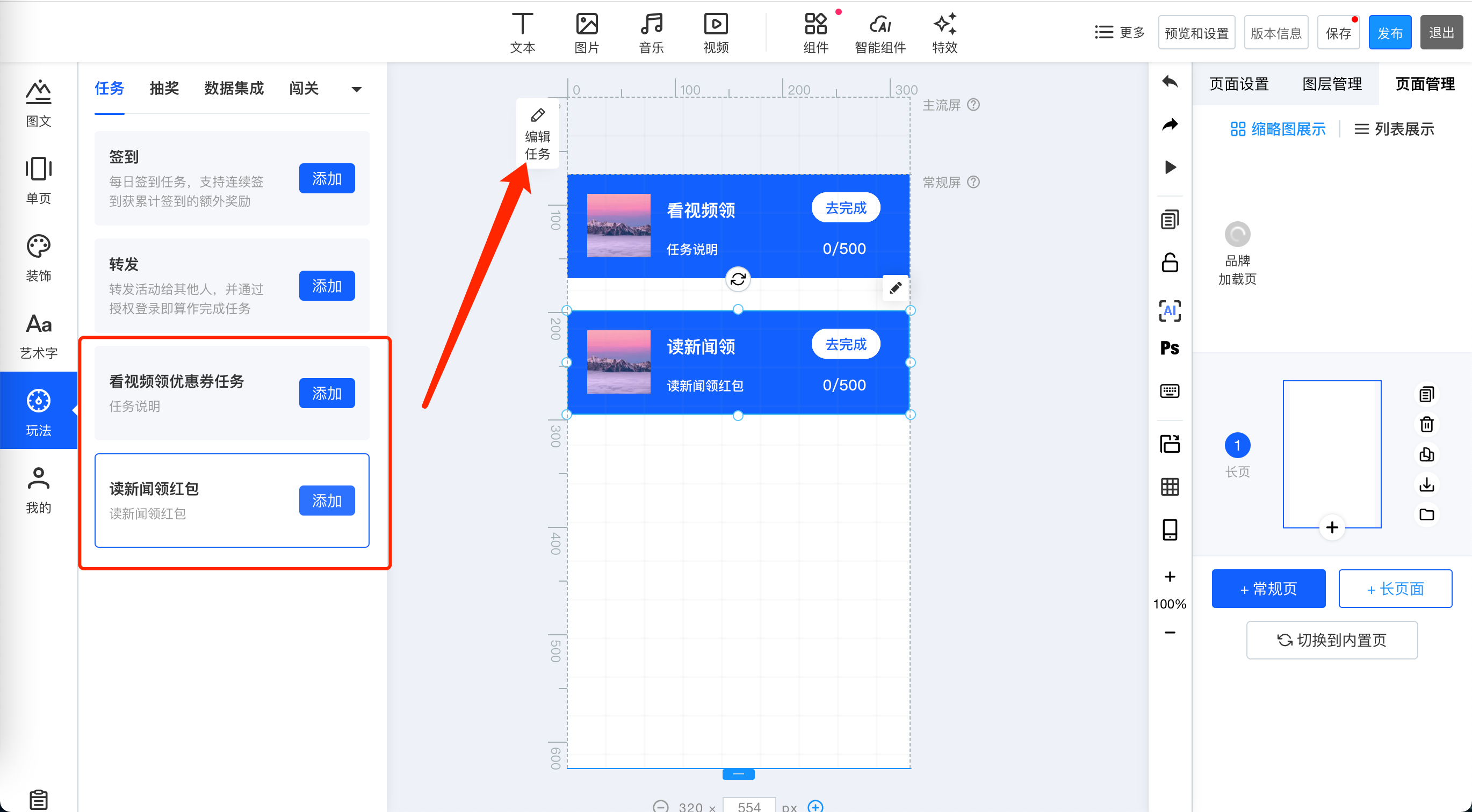 添加成功之后,在H5编辑器玩法中奖该自定义任务添加到画布中;