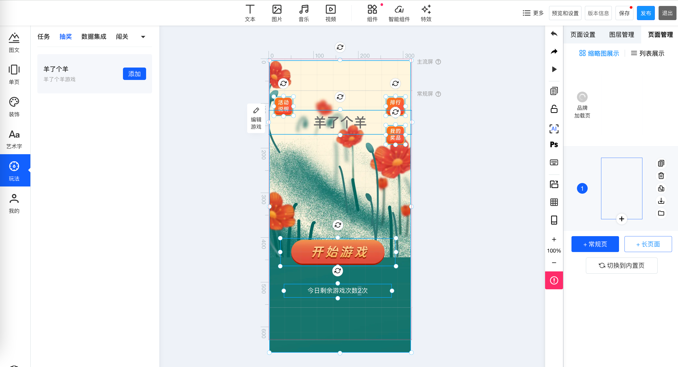 可根据应用场景不同,更换游戏背景图、元素、文本样式等;需要更换哪个元素,点击哪个元素,在弹出的组件设置中进行更换和调整即可;