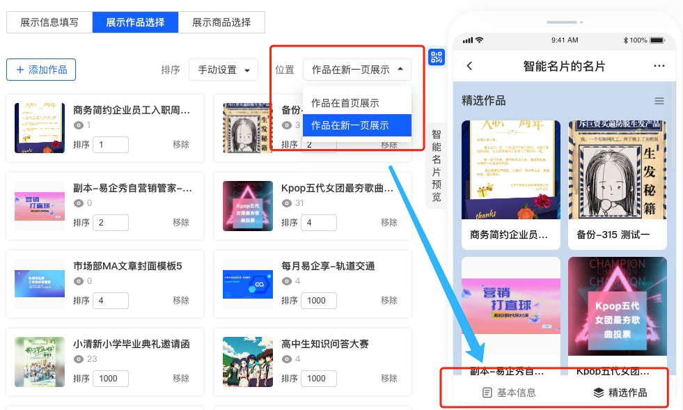 5、名片作品列表支持在首页、在新一页两种方式展示