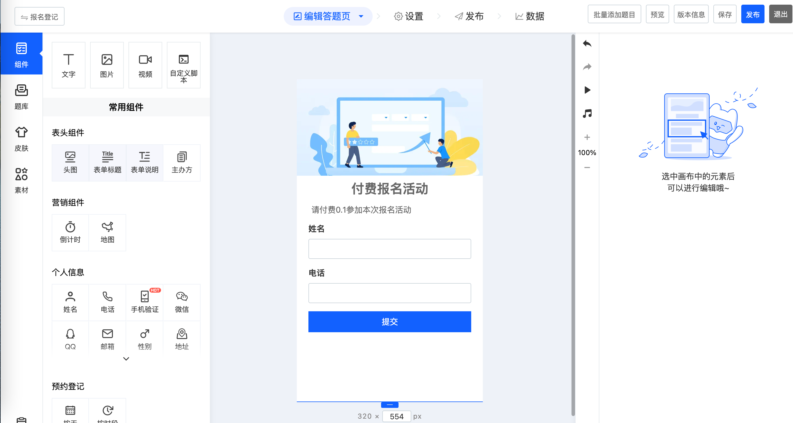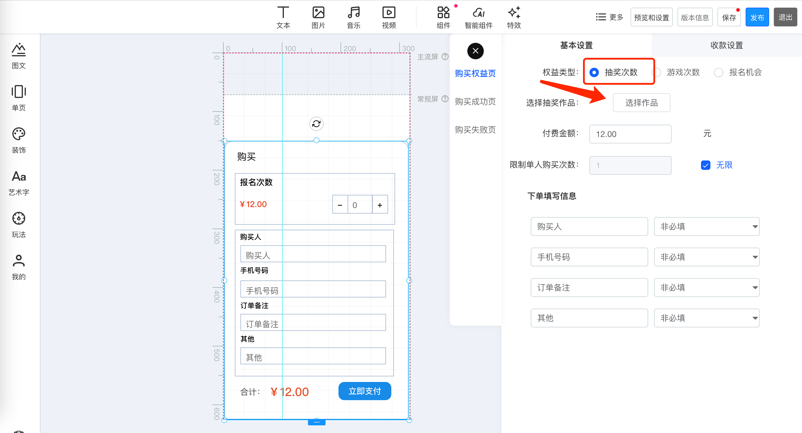H5新增玩法“购买权益”,可以设置购买活动权益,访客活动次数不足时,可付费增加活动次数;或者帮助主办方实现“付费报名”、“付费抽奖”、“付费游戏”等营销场景。