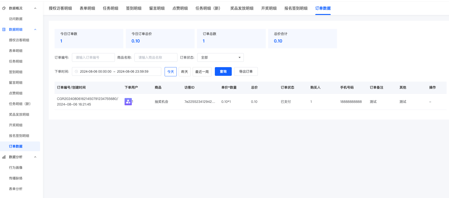步骤⑦:购买的订单数据可在H5作品的数据管理-订单数据查看