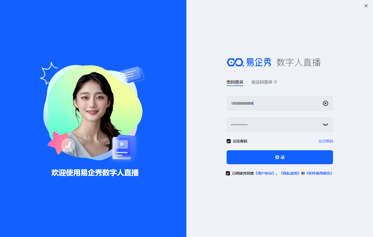 安装完成后,打开易企秀数字人直播客户端,在登录界面输入管理员提供的账号密码,登录即可。