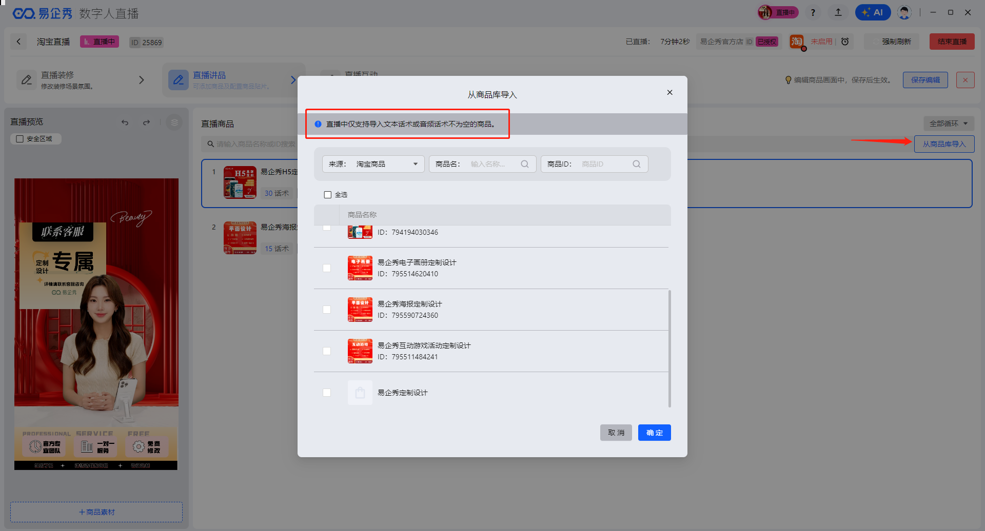 直播中,仅支持导入文本话术或音频话术不为空的商品