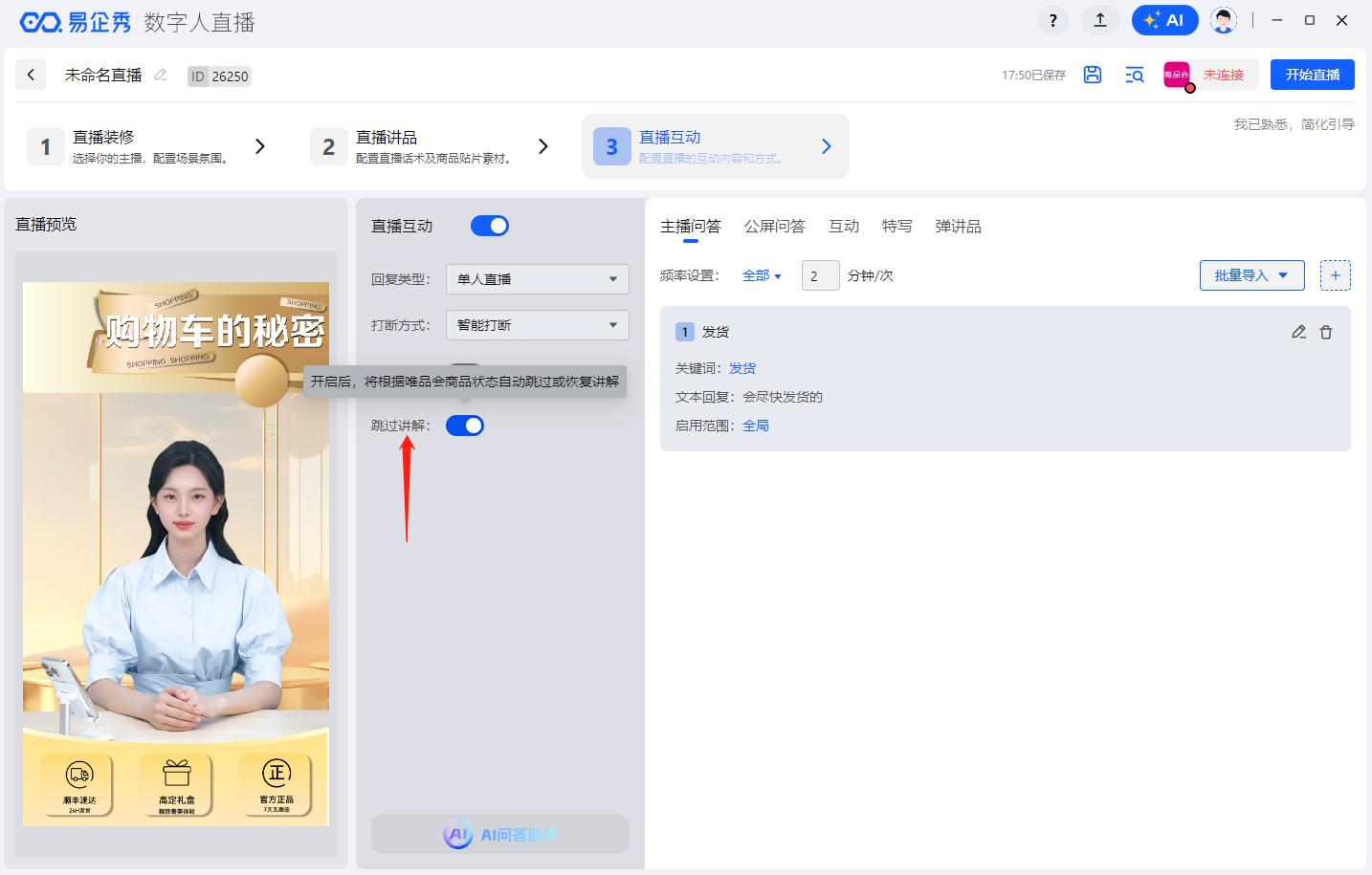 唯品会互动状态为已连接的条件下,开启「跳过讲解」按钮,系统将自动根据平台直播间对应商品的上下架状态来确认是否跳过讲解;