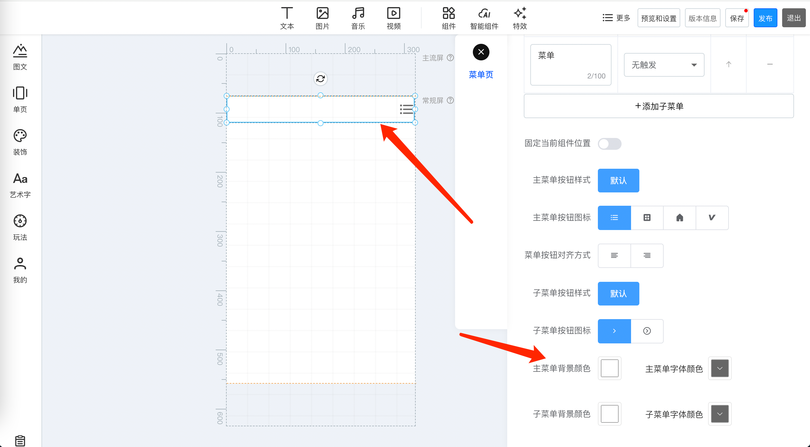 - 支持将画布中主菜单icon拖动出一个框,支持更换主菜单背景颜色,支持更换主菜单按钮对齐方式:左对齐、右对齐;