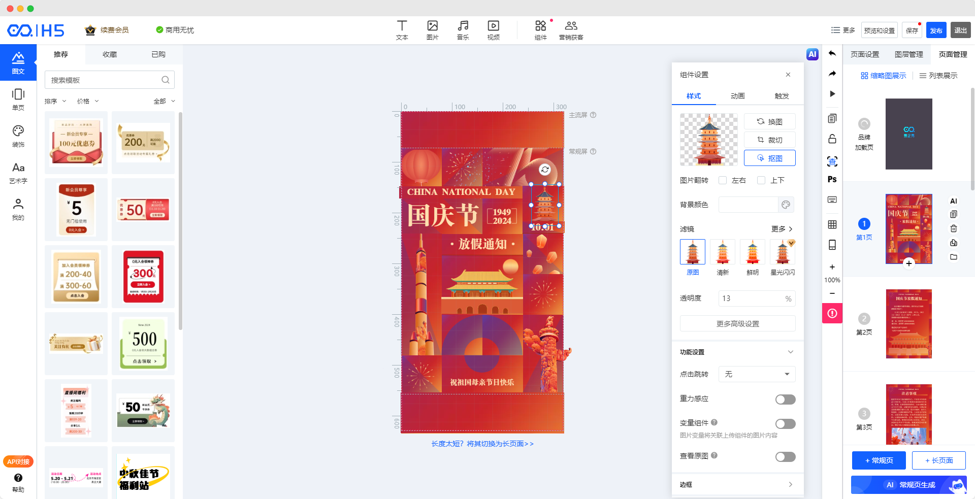 进入长页编辑器,选中任意图片,在右侧“图片”设置处,点击“抠图”即可。