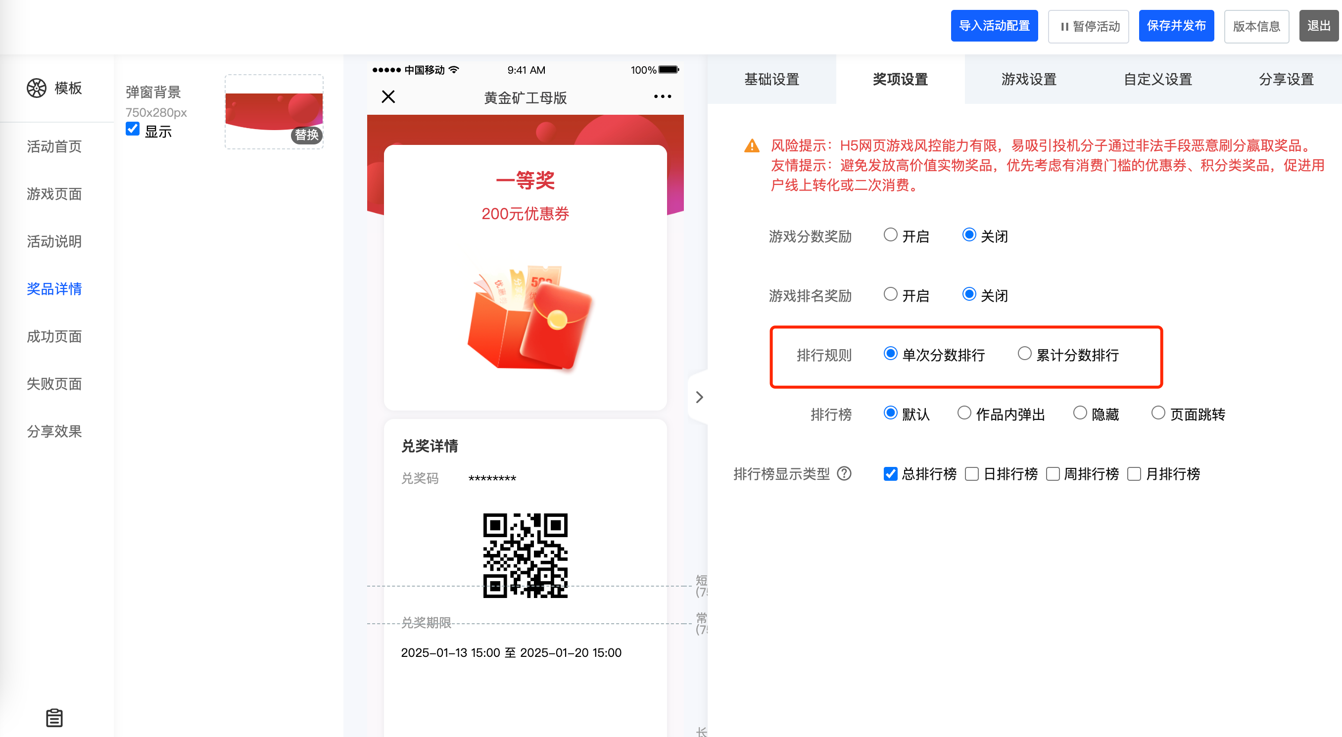 为了满足用户需求,我们在互动游戏和互动游戏加抽奖的排行榜规则中,新增了按照累计分数进行排行,用户可自行选择。