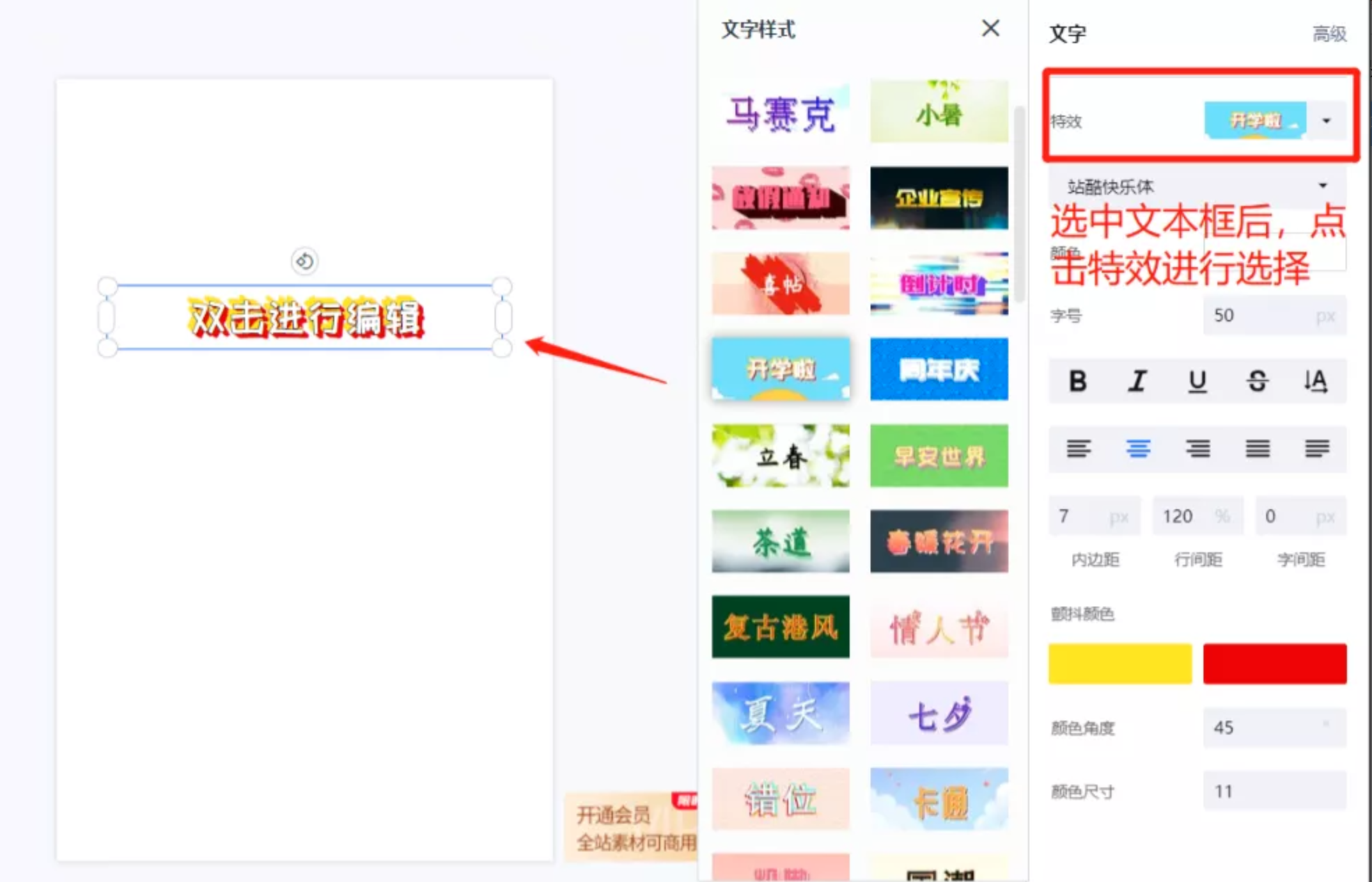 字体特效:选中文本框后,在右侧点击特效选择合适的预设效果。