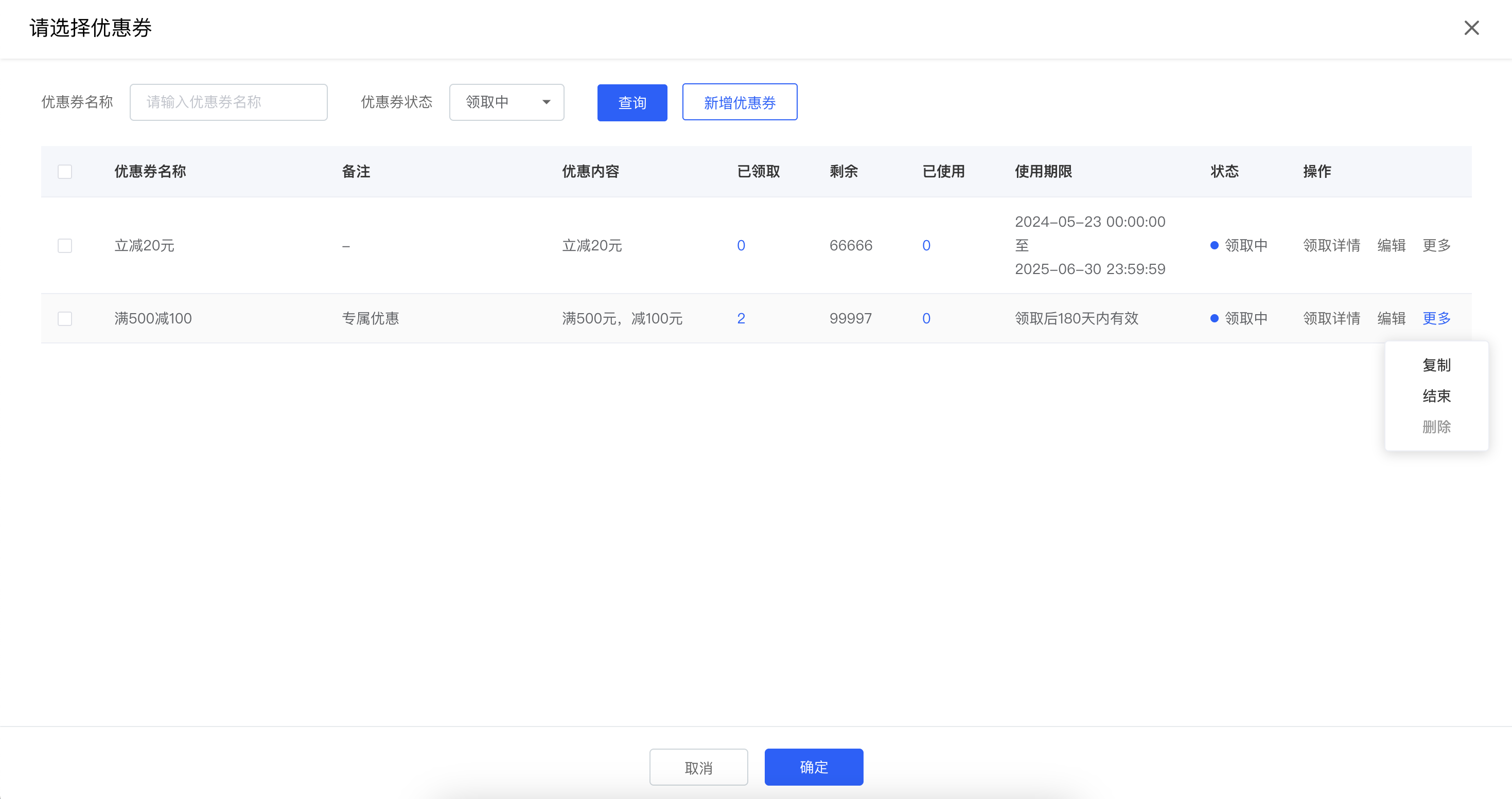 3、添加优惠券,可新增优惠券,也可从优惠券库中增加。新增优惠券,可配置如下字段。