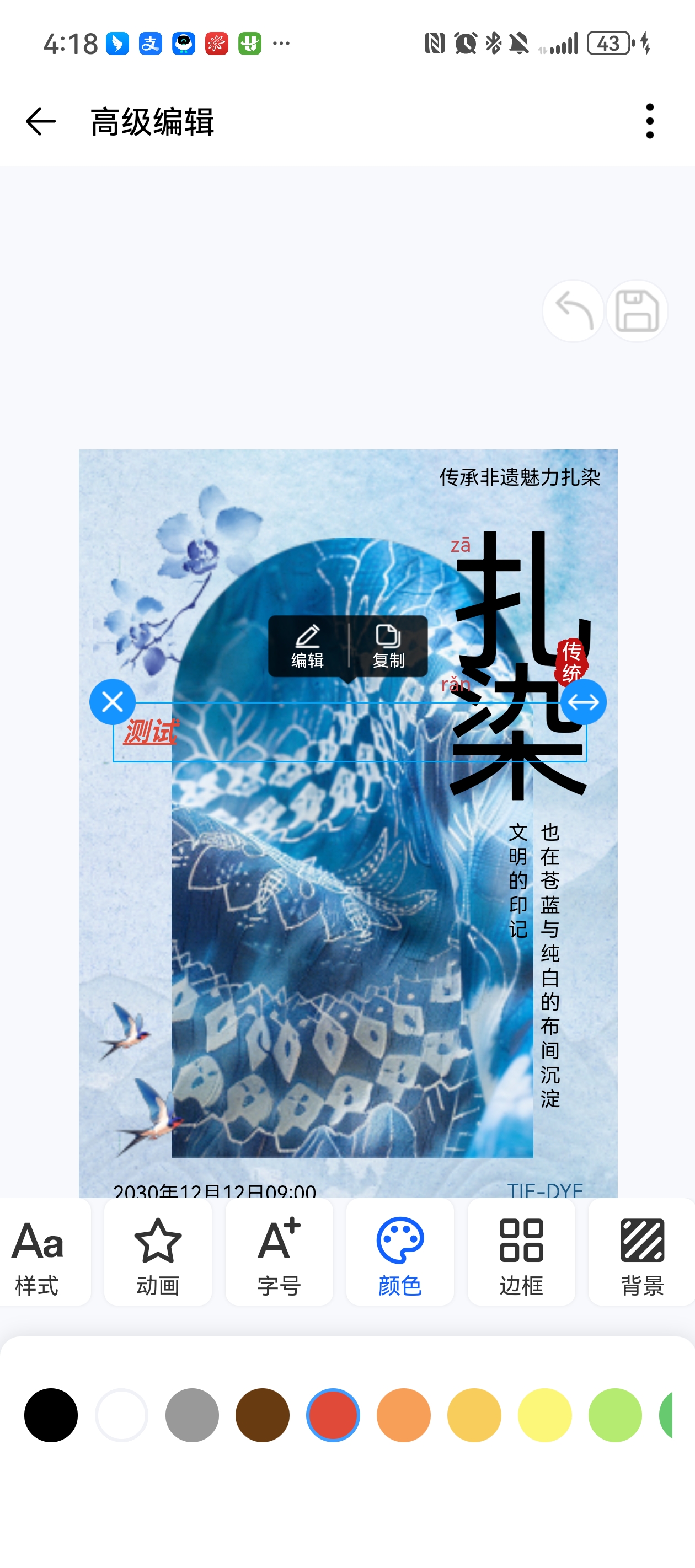 2.4、点击添加文字,出现编辑文字页面,编辑完成之后,添加的文字出现在画布中,支持对添加的文字进行再次编辑,支持复制当前文字、删除当前文字,支持修改文字的样式,居左居右居中、加粗、斜体、增加下划线等样式,支持添加动画,选择动画之后,画布中可以出现动画的即时效果,支持对文字修改颜色,支持对文字增加边框和修改文字的背景颜色。