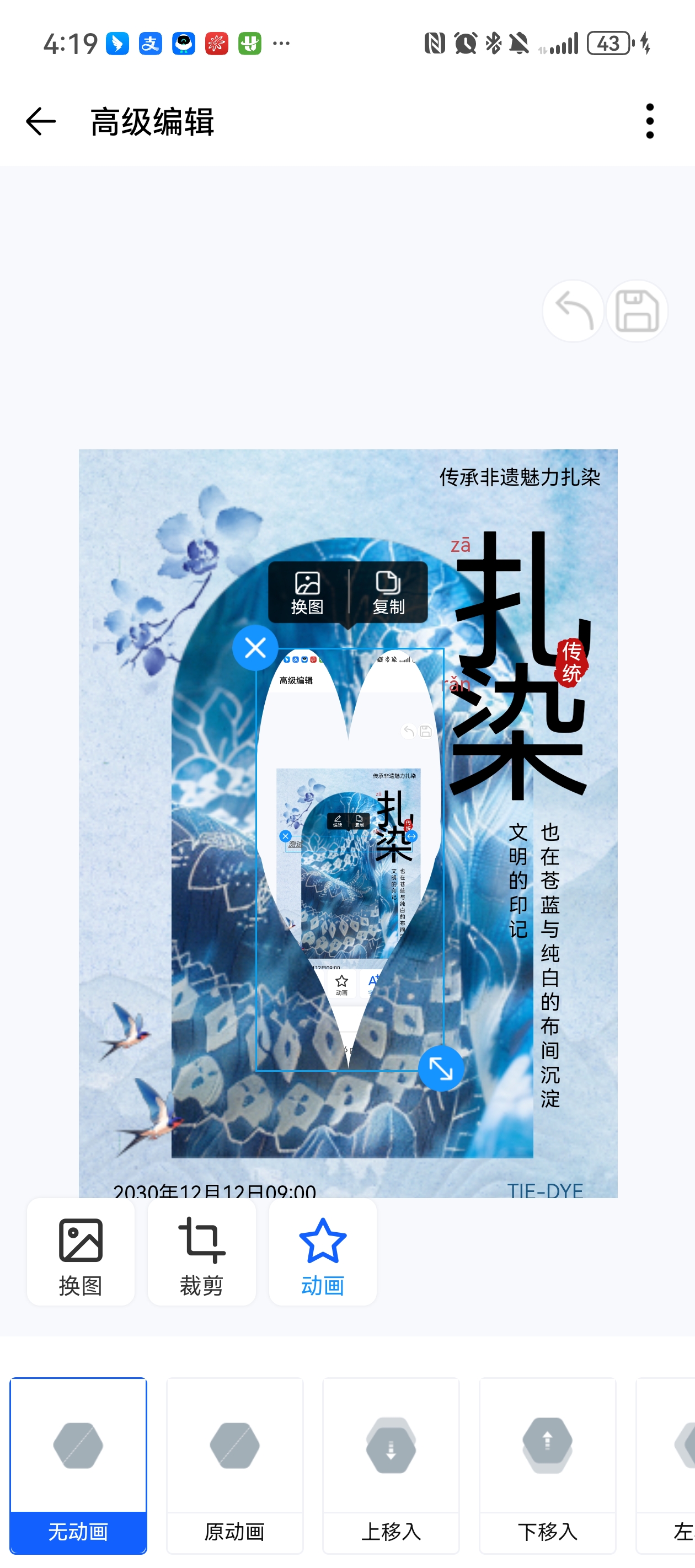 2.5、点击添加图片,调出系统图片库或者拍照来添加图片,上传之后,会出现裁剪,支持形状裁剪和比例裁剪;图片支持动画,选择动画之后,在当前画布出现即时效果