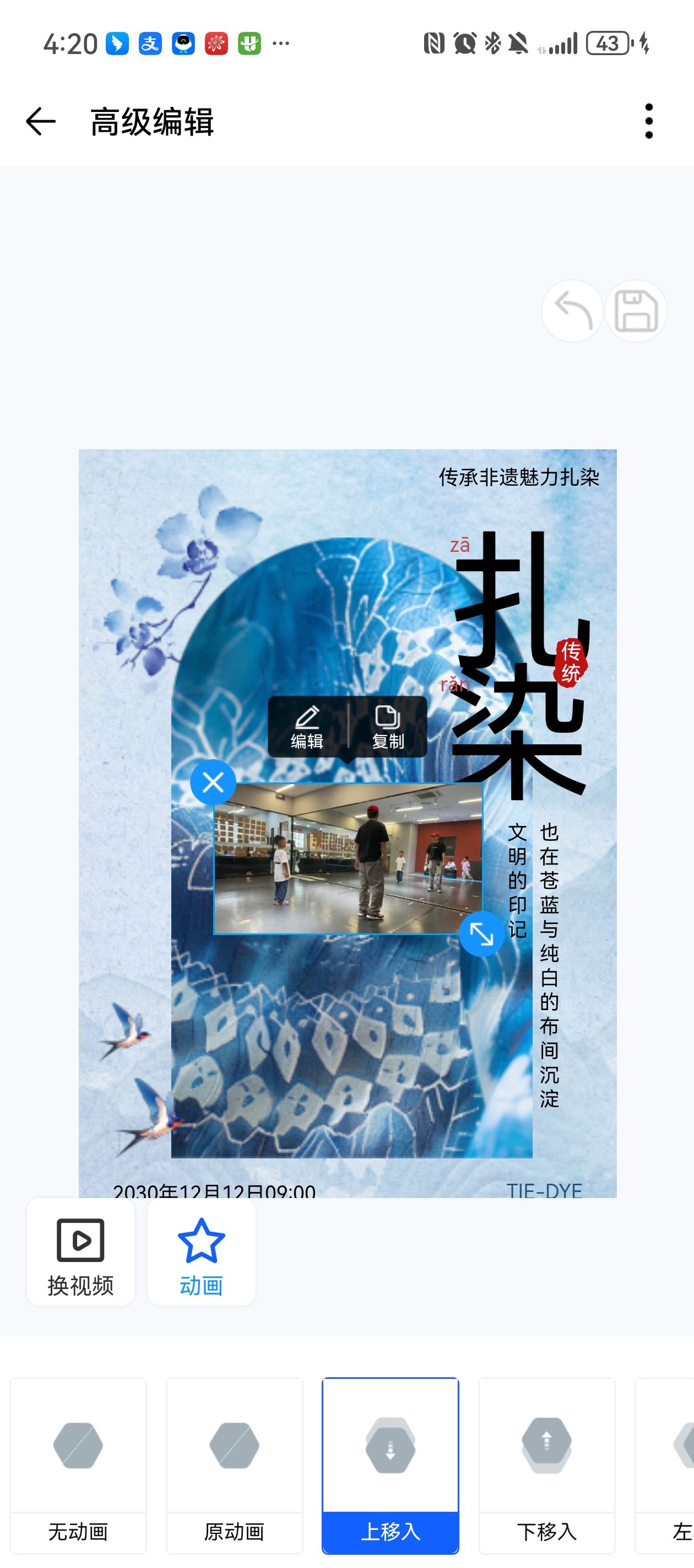 2.6、点击添加视频,调出系统视频库来录制视频,选择视频之后,允许拖动视频位置,拉动改变视频尺寸,支持复制、删除视频;允许更换视频和添加视频动画,添加动画之后,在当前画布出现即时效果