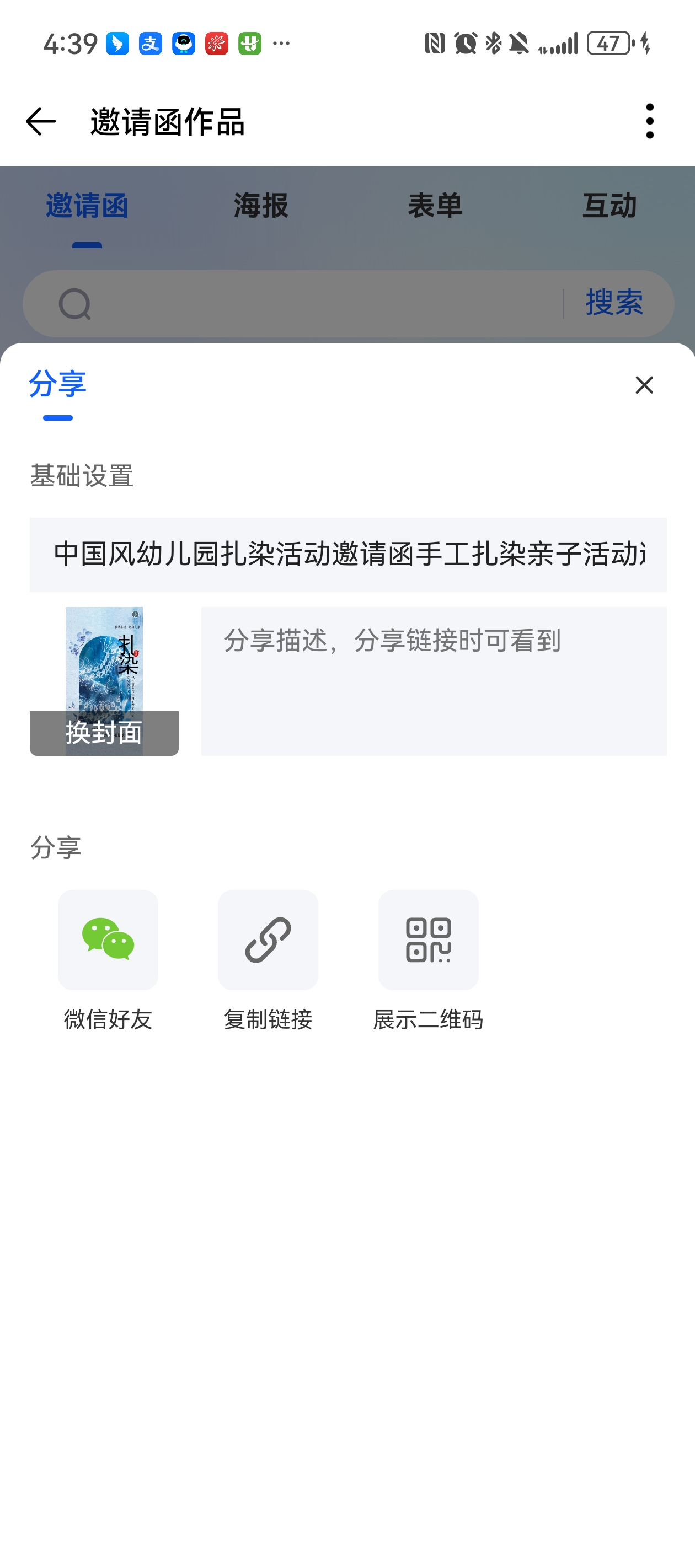 3、修改之后,点击右上角导出,到我的作品列表,海报页面,支持点击编辑进入编辑器进行修改,点击分享进入预览页面,支持长按保存至手机,支持编辑海报名称和描述,支持复制和删除海报。