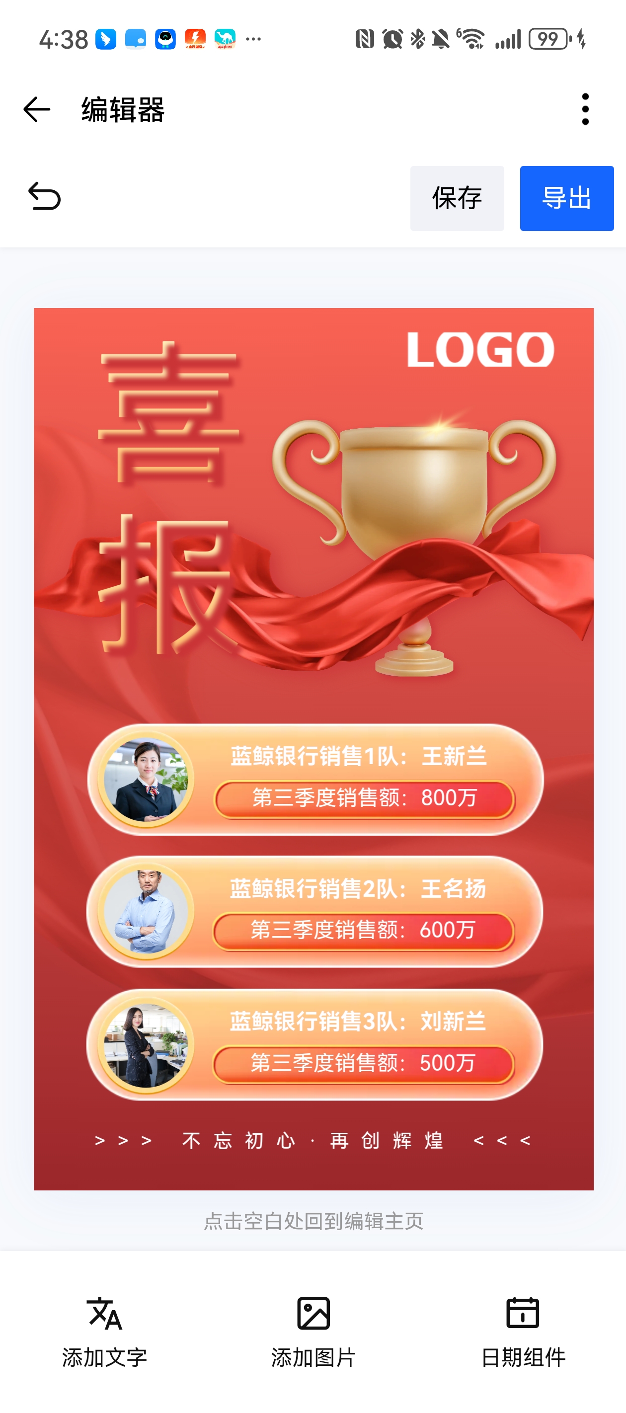 2、海报编辑器中,点击添加,支持添加文字、图片和日期组件