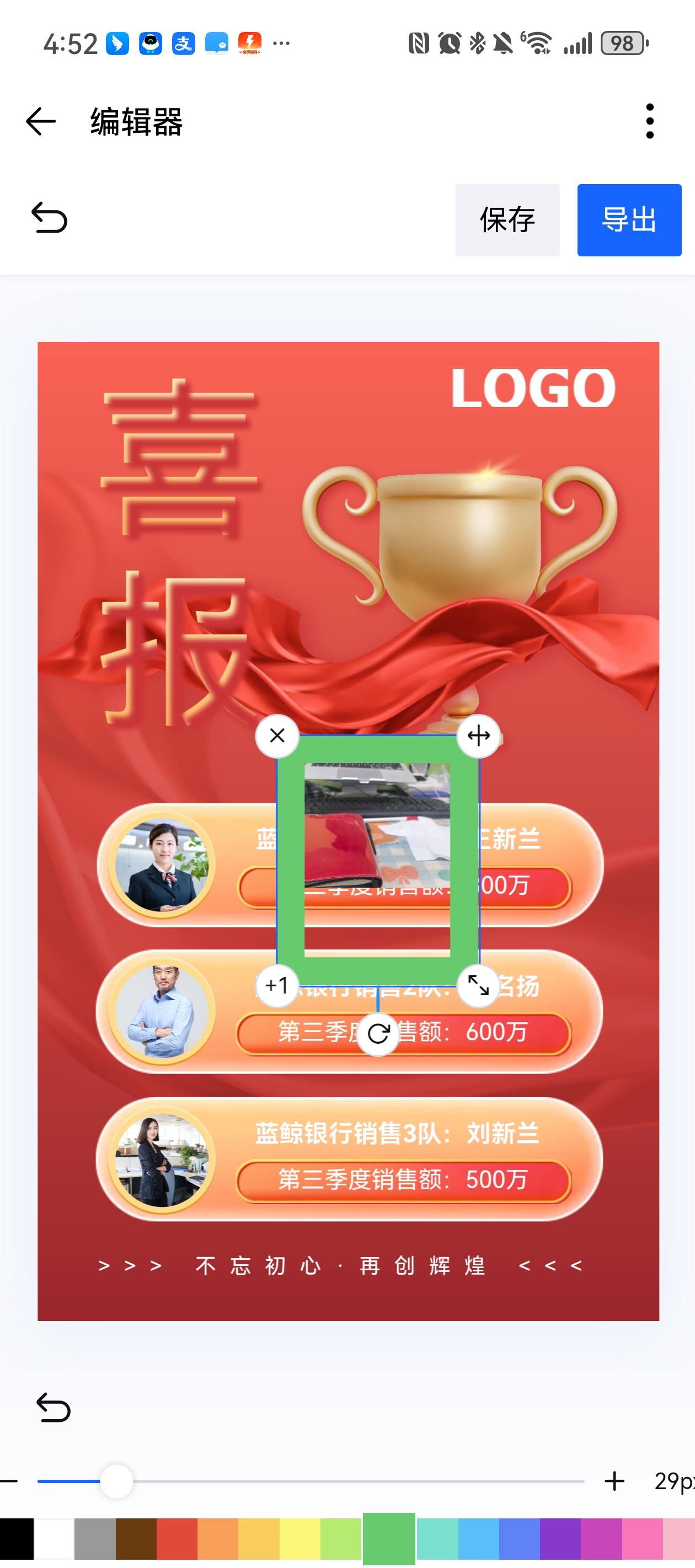 2.3、在海报编辑器中,点击添加图片,弹出选择上传方式,通过拍照或者选择图片库中的图片,选择之后,出现图片裁剪,支持形状裁剪和比例裁剪,点击确定,添加到画布中;支持拖拽图片的位置、拖动改变图片的大小尺寸;支持添加图片边框,修改图片边框的颜色;