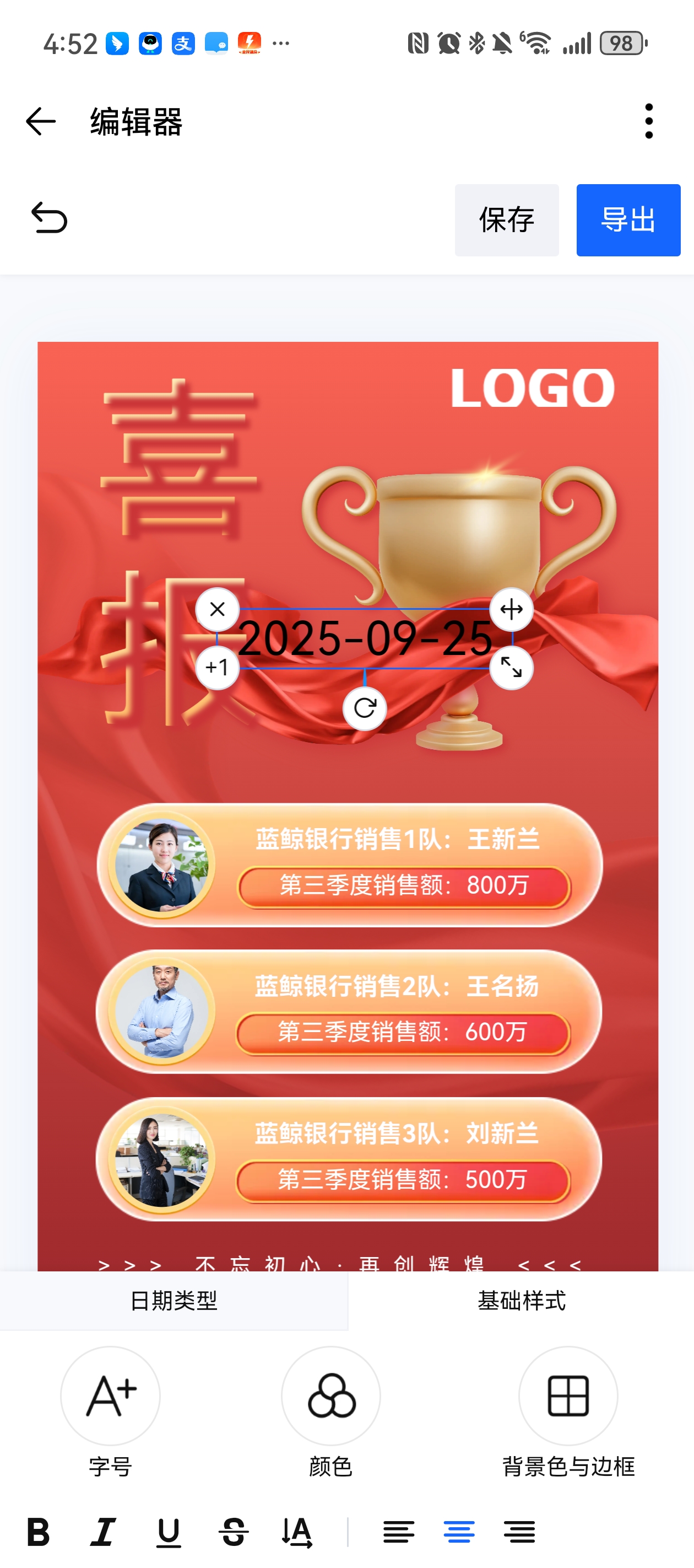 2.4、点击添加日期组件,画布中出现当前日期,可以选择日期类型,修改基础样式,包括字号、颜色、背景色和边框,加粗、斜体、下划线、居左、居右居中等;支持拖拽改变位置、拖动改变大小尺寸