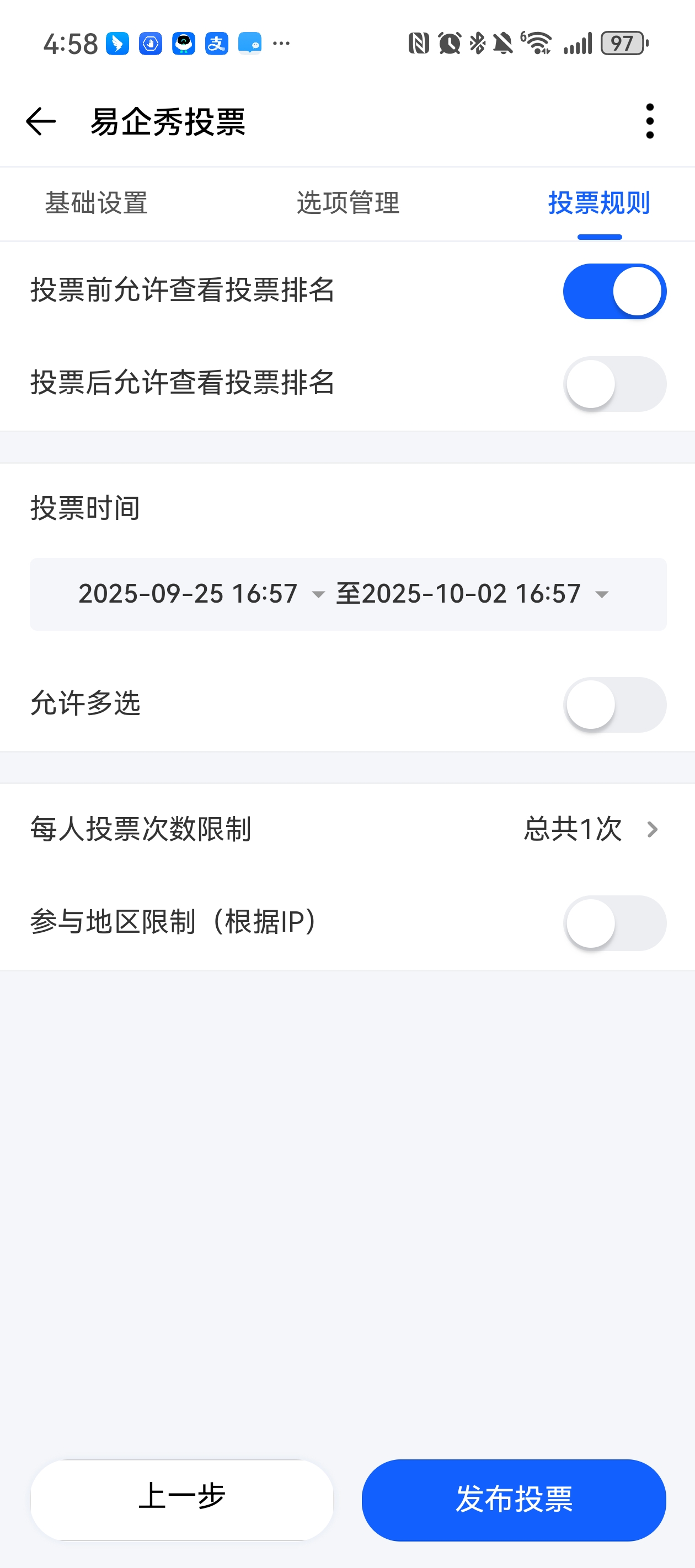2、投票评选类,点击使用进入编辑器,支持对投票评选作品进行活动标题、活动主图和活动说明的编辑,点击下一步,支持添加投票选项,可以设置是否允许访客自主报名,设置之后点击下一步,设置投票规则;设置完成之后,点击发布投票