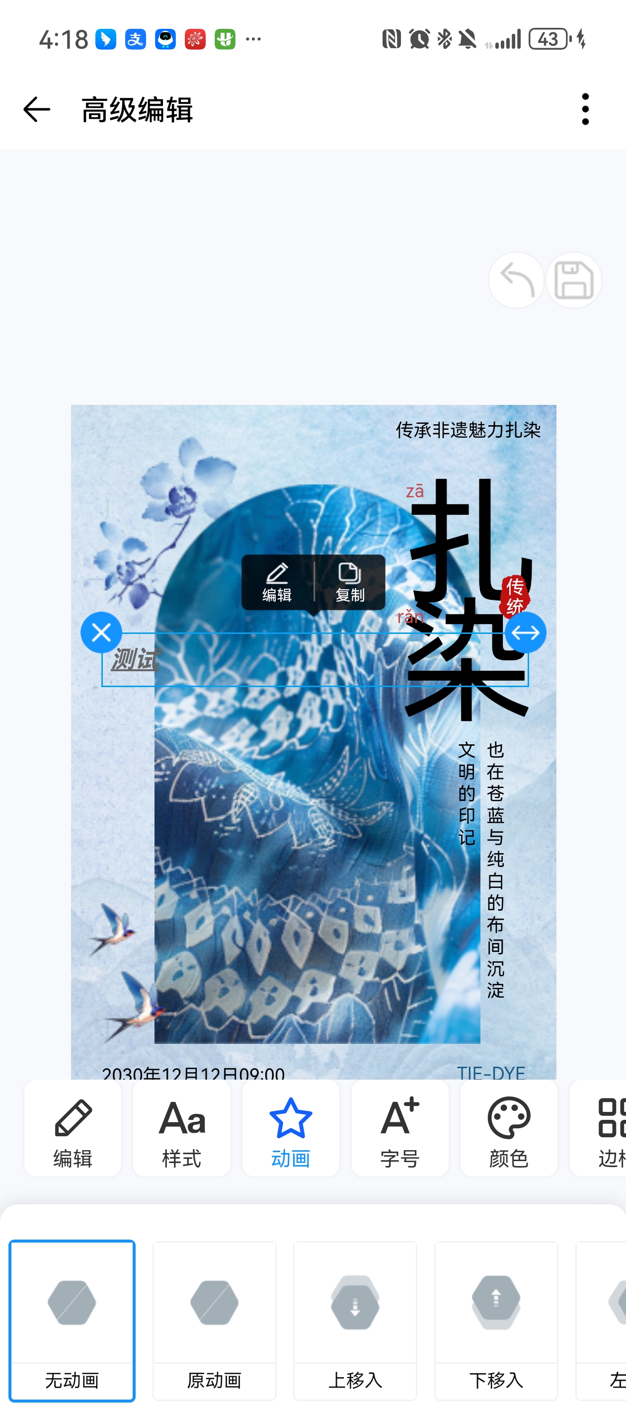 2.4、点击添加文字,出现编辑文字页面,编辑完成之后,添加的文字出现在画布中,支持对添加的文字进行再次编辑,支持复制当前文字、删除当前文字,支持修改文字的样式,居左居右居中、加粗、斜体、增加下划线等样式,支持添加动画,选择动画之后,画布中可以出现动画的即时效果,支持对文字修改颜色,支持对文字增加边框和修改文字的背景颜色。