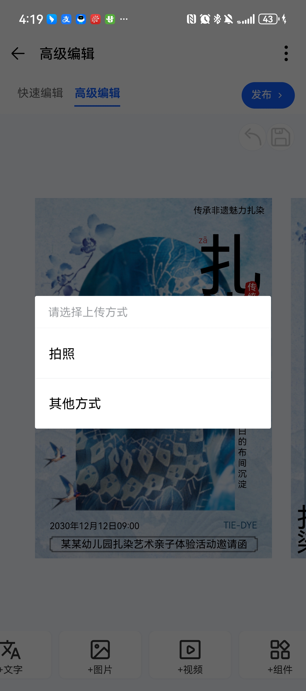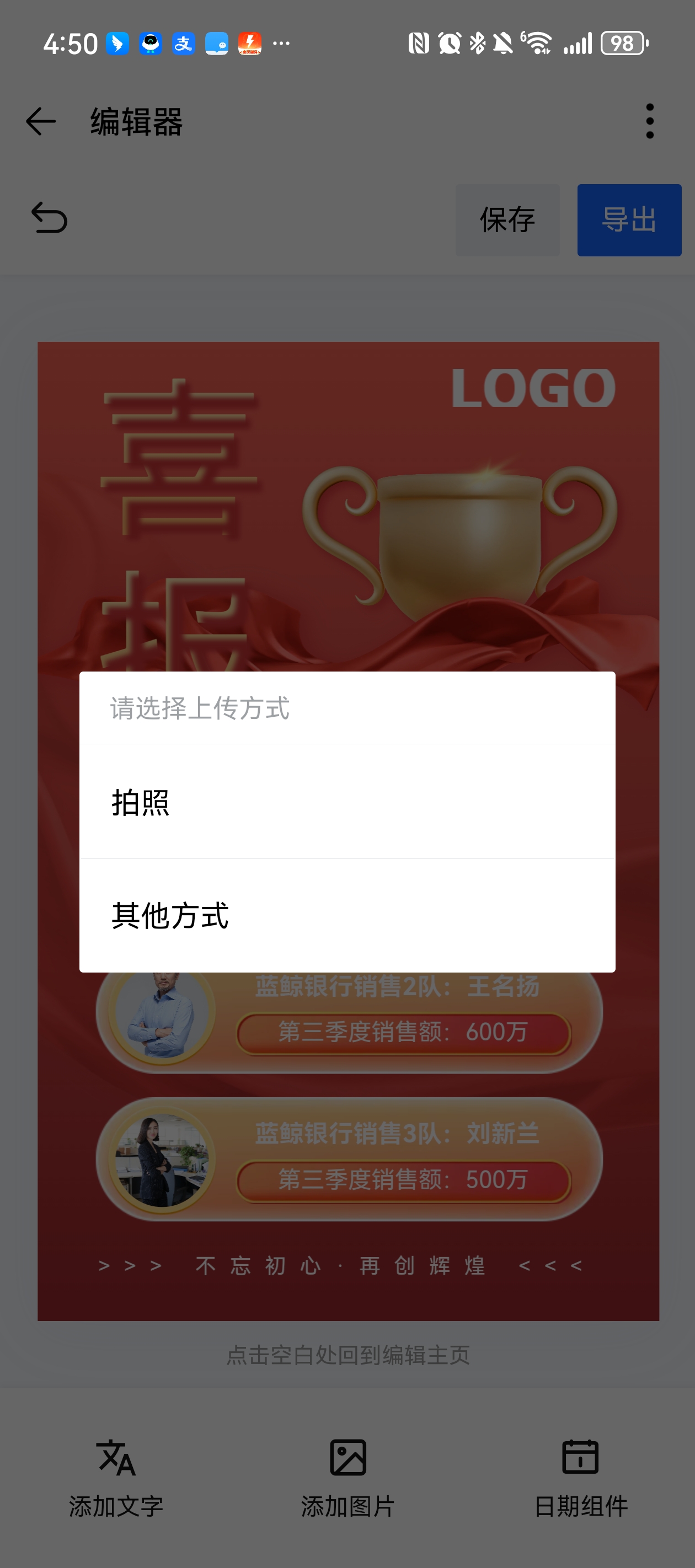 2、海报编辑器中,点击添加,支持添加文字、图片和日期组件