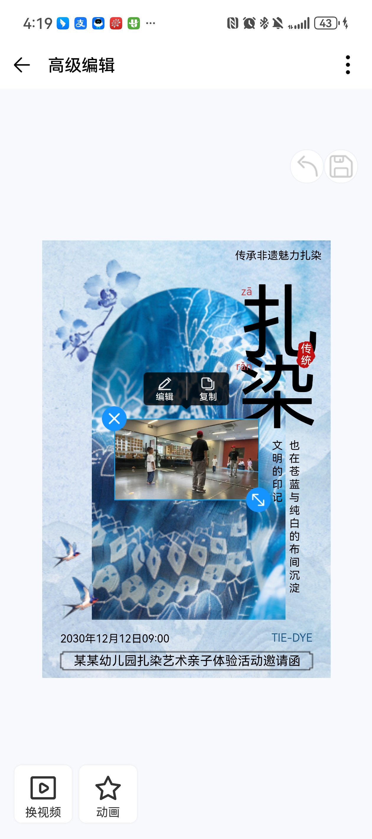 2.6、点击添加视频,调出系统视频库来录制视频,选择视频之后,允许拖动视频位置,拉动改变视频尺寸,支持复制、删除视频;允许更换视频和添加视频动画,添加动画之后,在当前画布出现即时效果