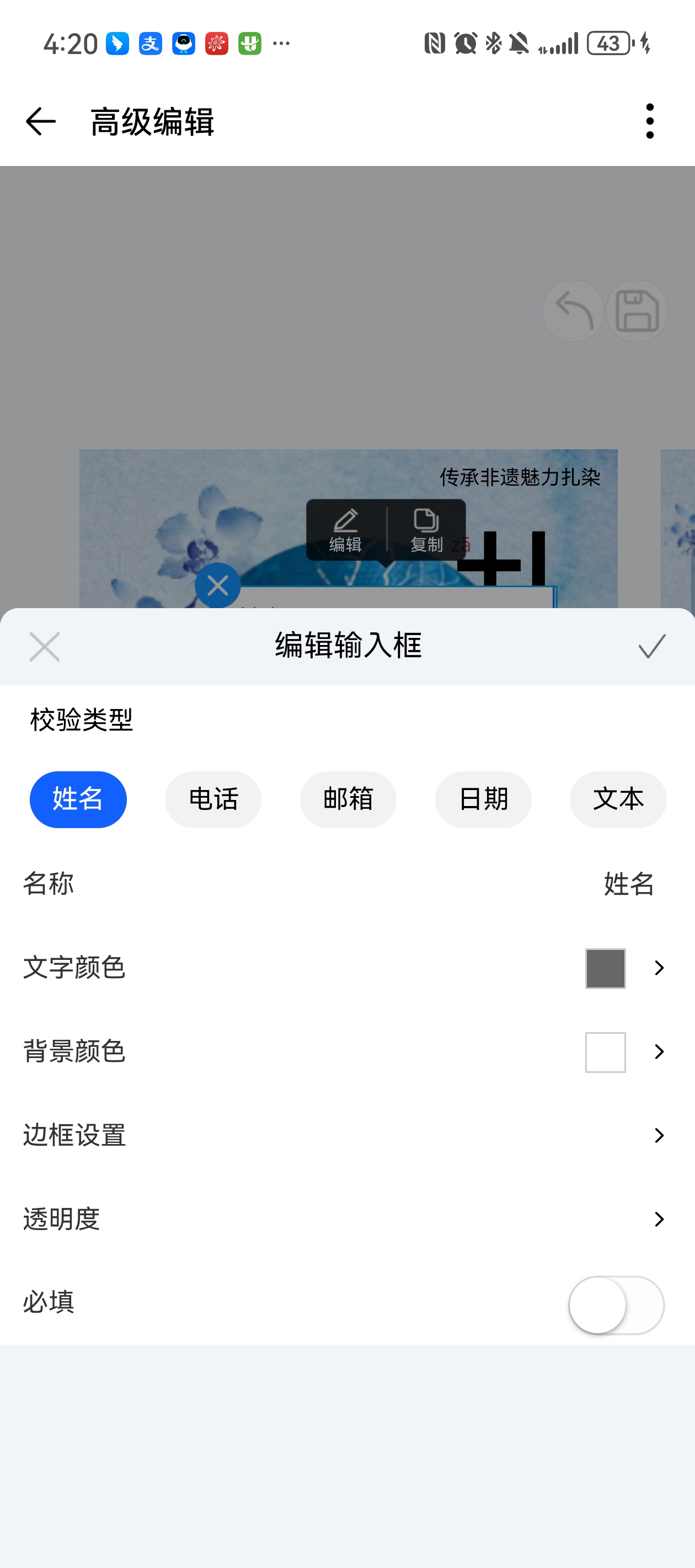点击添加输入框,出现编辑输入框,支持校验姓名、电话、邮箱、日期和文本,支持修改输入框显示内容,文字颜色、背景颜色、边框设置、透明度和是否必填;